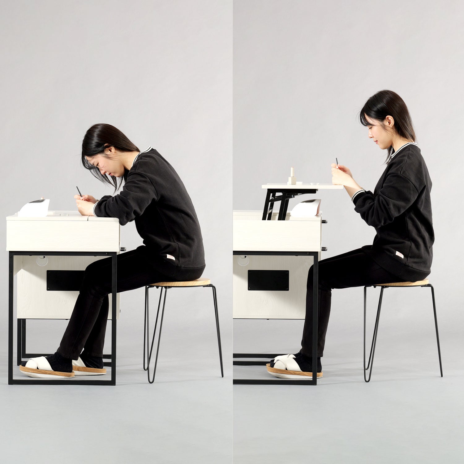 天板が胸元付近まで持ち上がるリフトアップ天板を搭載。猫背にならず手元が安定しやすいので、痛ネイル・概念ネイルなどの細かいデザインも楽に作業することができます。