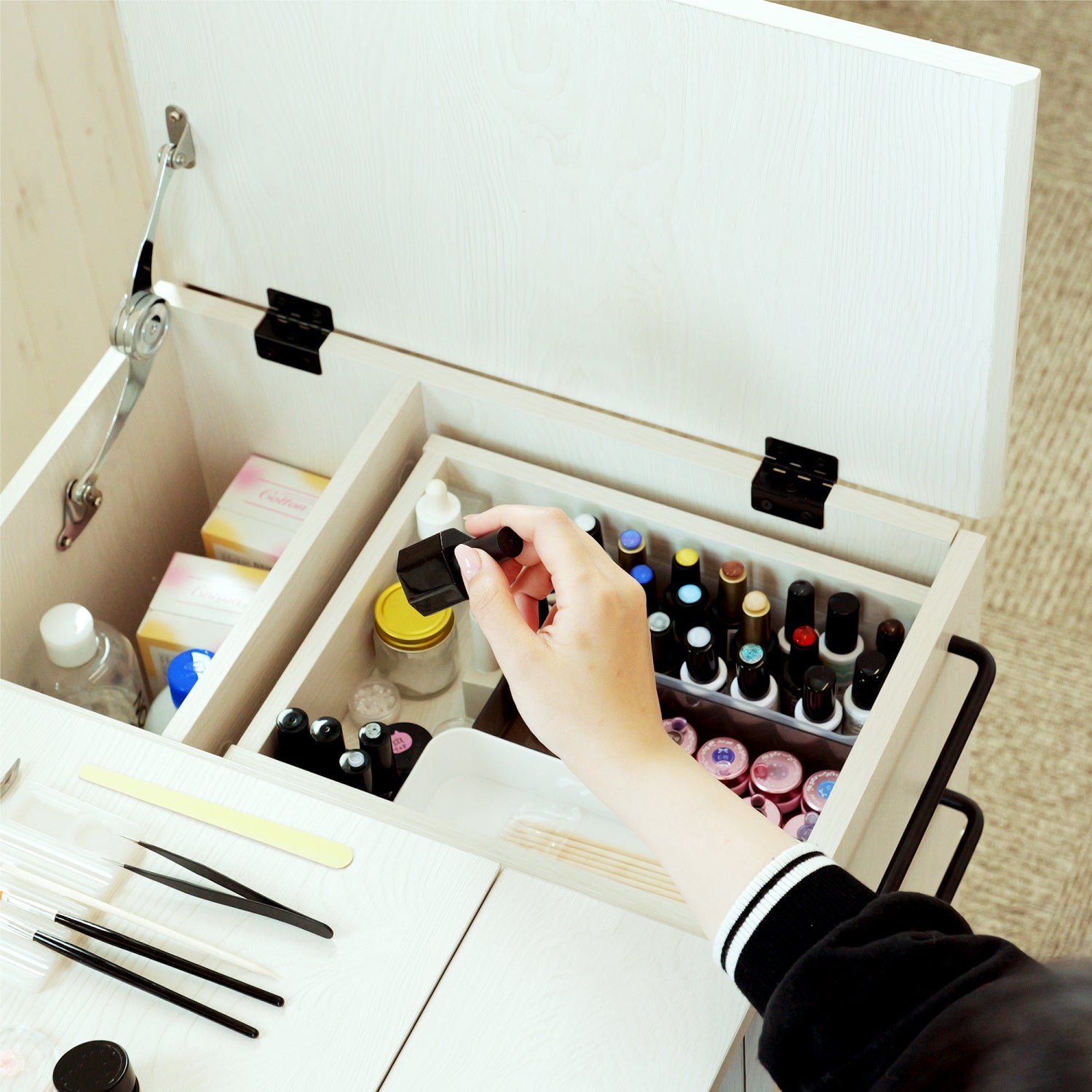 ネイル用品の収納に特化した引き出しは、天板部分もフルオープ可能。作業中も道具の出し入れがしやすい設計です。
