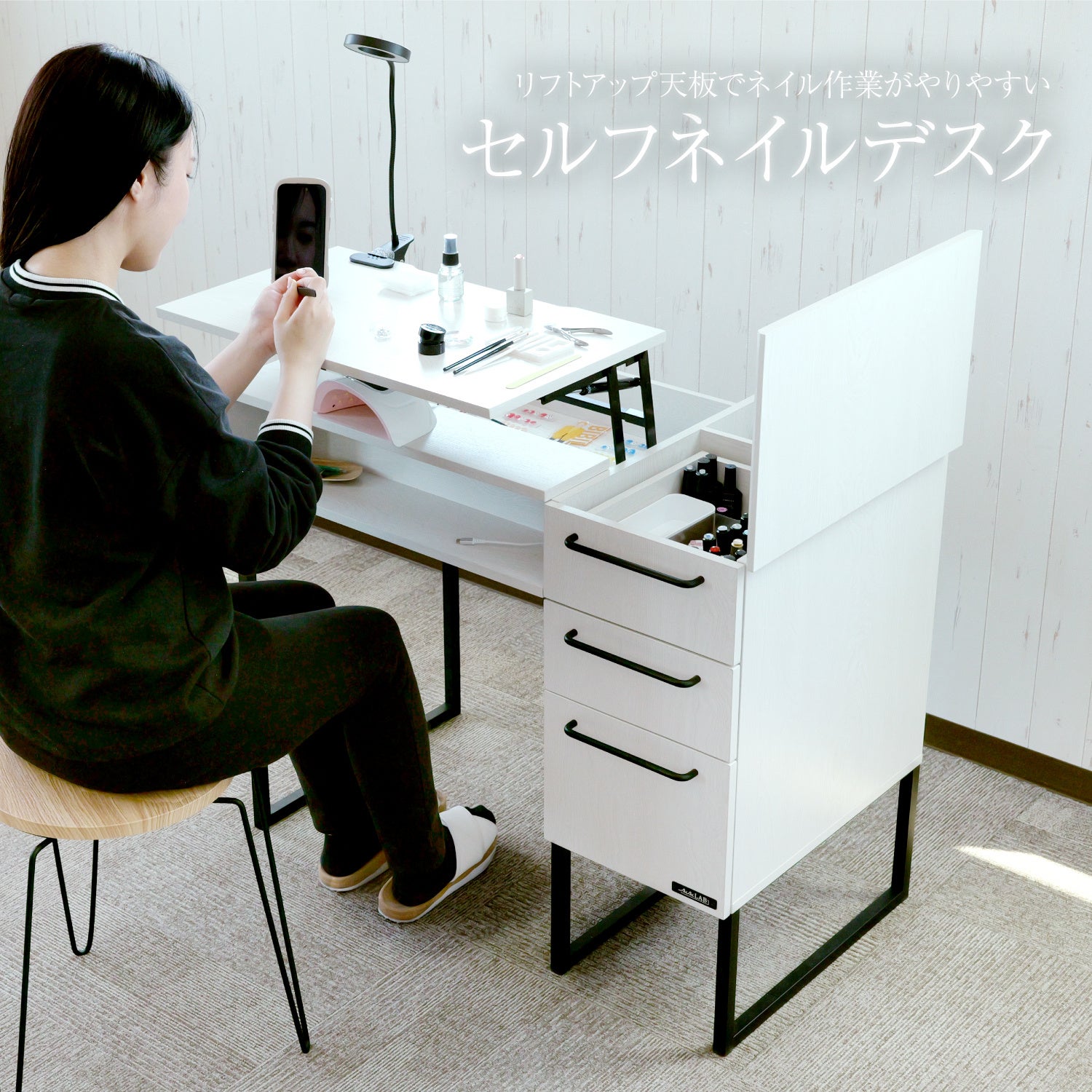 ネイルには、手元での細かく繊細な作業がつきもの。そんな作業を少しでも快適に行えるよう、工夫を詰め込んだセルフネイルデスクです。