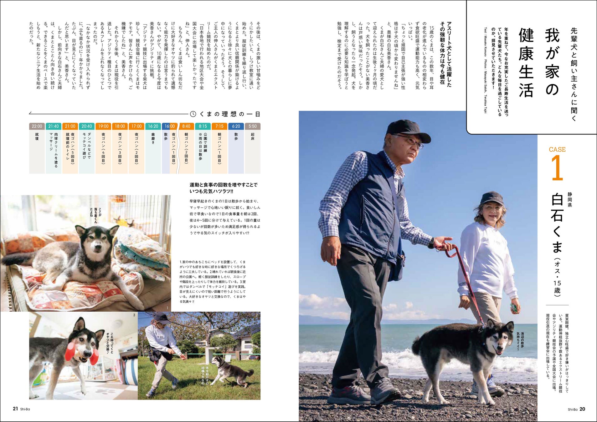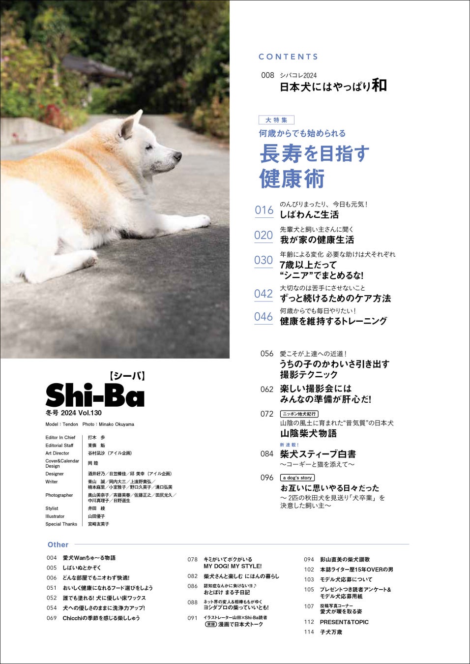 獣医療の発達にともなって、犬の平均寿命が年々上がっている昨今。「愛犬にはいつまでも健康に、そして長生きしてほしい!」というのが飼い主さん共通の想いと言えるでしょう。とはいえ「健康的な長寿」をどのようにして目指せばよいのか、何を始めればいいのか悩む飼い主さんは少なくないはず。本号では日々の暮らしの中で実践できる健康法を特集します。さらに、20年以上続く『Shi-Ba』だからこそ見つけられた、ご長寿日本犬たちの健康生活事情を紹介。愛犬の年齢にかかわらずご長寿を目指せるアイデアが詰まっています。