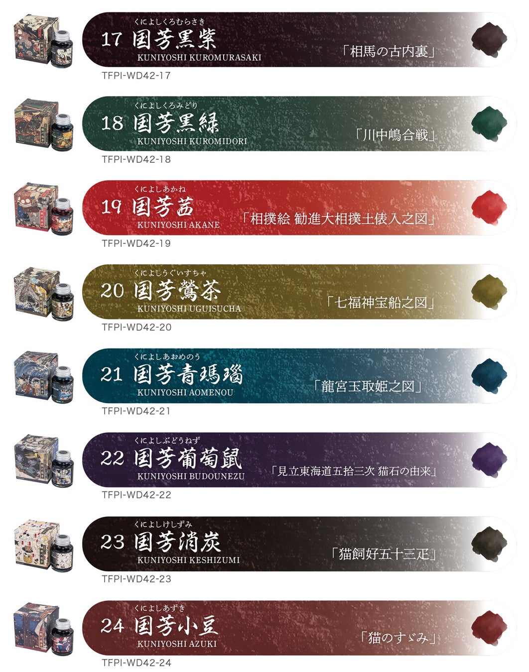 「浮世絵インク 歌川国芳」は、浮世絵作品から色の着想を得てカラー調色した万年筆用・水性染料インクシリーズです。文具ソムリエの石津 大氏がプロデュース、カラーコンサルタントの松本 英恵氏がカラー監修を行っています。