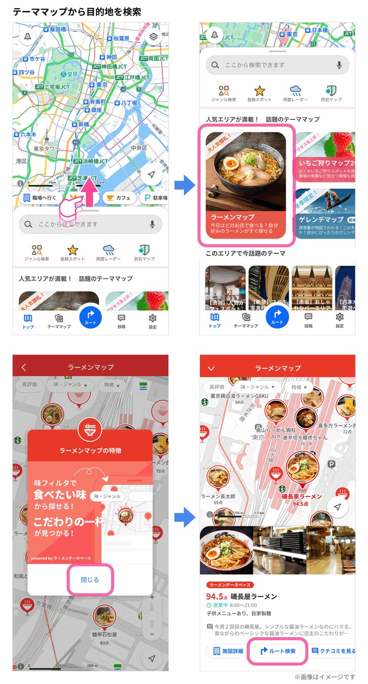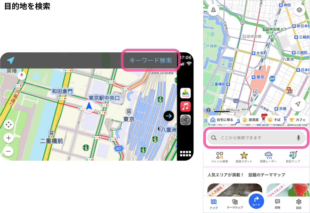 「CarPlay」接続時のiPhone側の操作は「Yahoo! MAP」の通常操作と変わらないため、ユーザーは、新たに操作を覚えることなく、目的地設定、ルート検索、ナビの実行、そして、ラーメンマップやいちご狩りマップなどのテーママップや登録スポットから目的地検索もできます。(画像1)