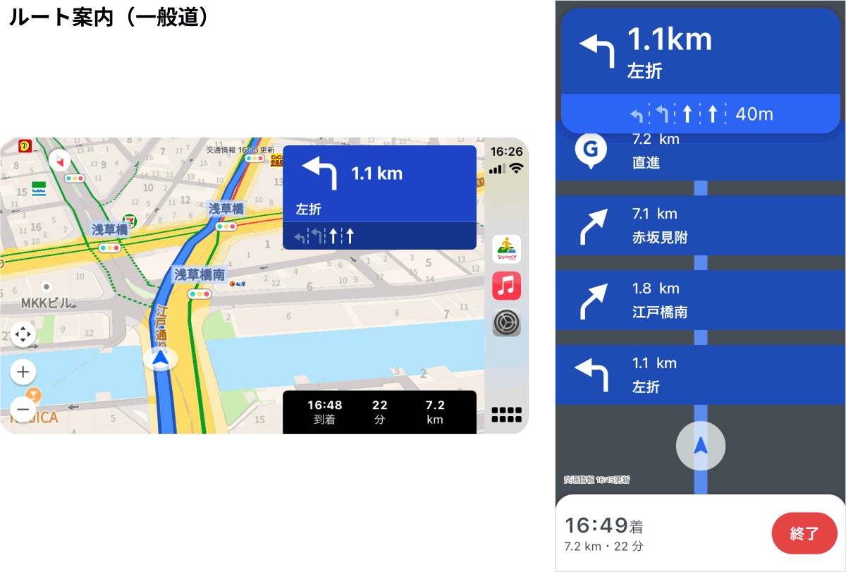 4:ルート案内が開始し、車載機器の画面では次の案内ポイントのみが表示され、iPhoneの画面では経路全体の案内ポイントがリスト表示されます。