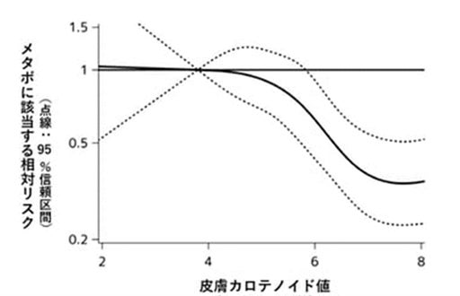 著者らが考察している通り、カロテノイドの生理作用に関するこれまでの種々の研究を踏まえると、カロテノイドを多く摂取することだけでこれほどまでにメタボリスクが下がる(野菜や果物をたくさん食べたからメタボになりにくかった)とは言えません。しかし、皮膚カロテノイド値が高くなることと関係する何らかの生活習慣や環境が、メタボリスクの低値と関係するものと考えられます。