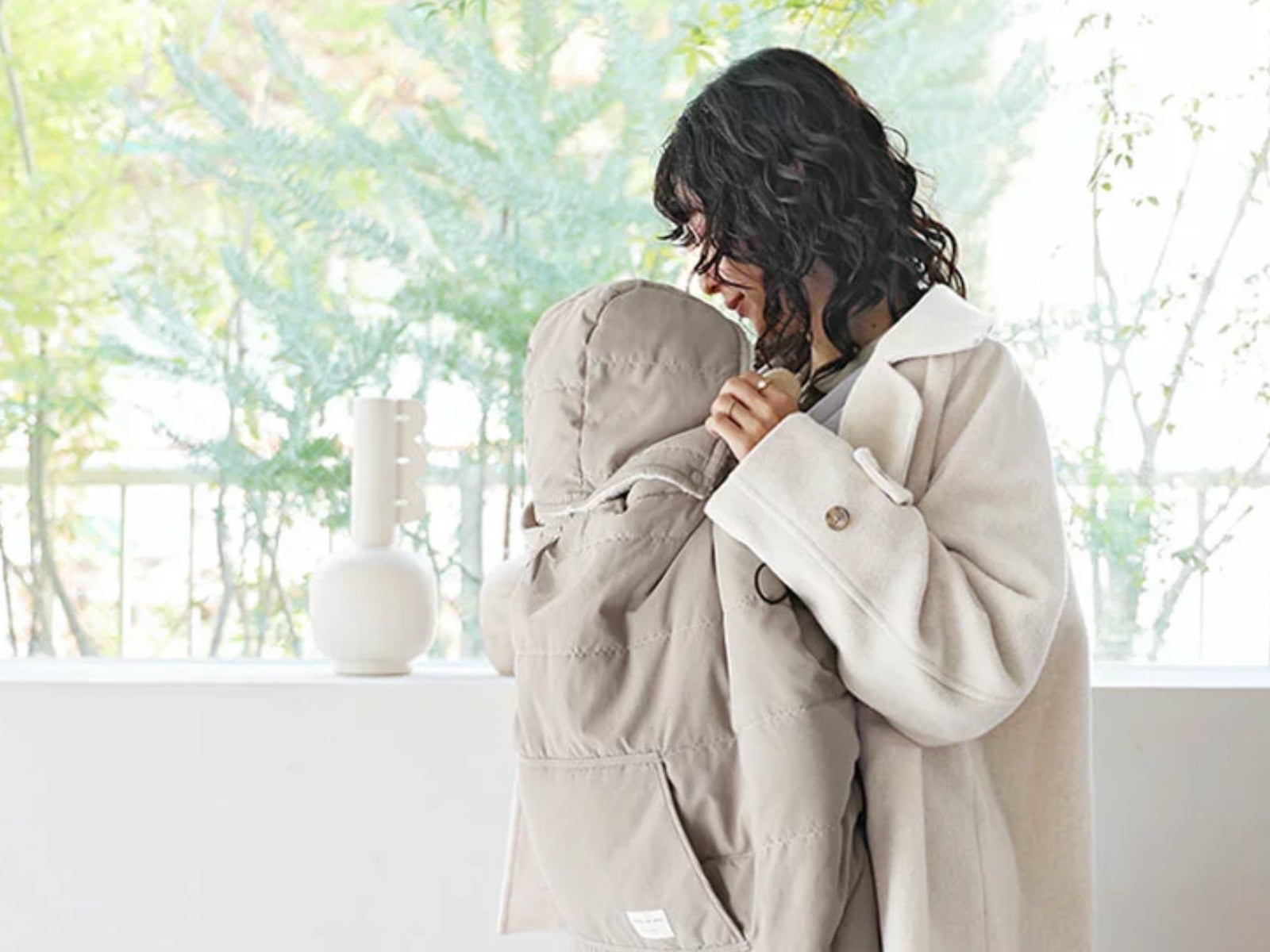 クリップで抱っこ紐に取り付ければ防寒ケープに。足元のスナップボタンやドローコードを調節することで、隙間風の侵入も防げます。