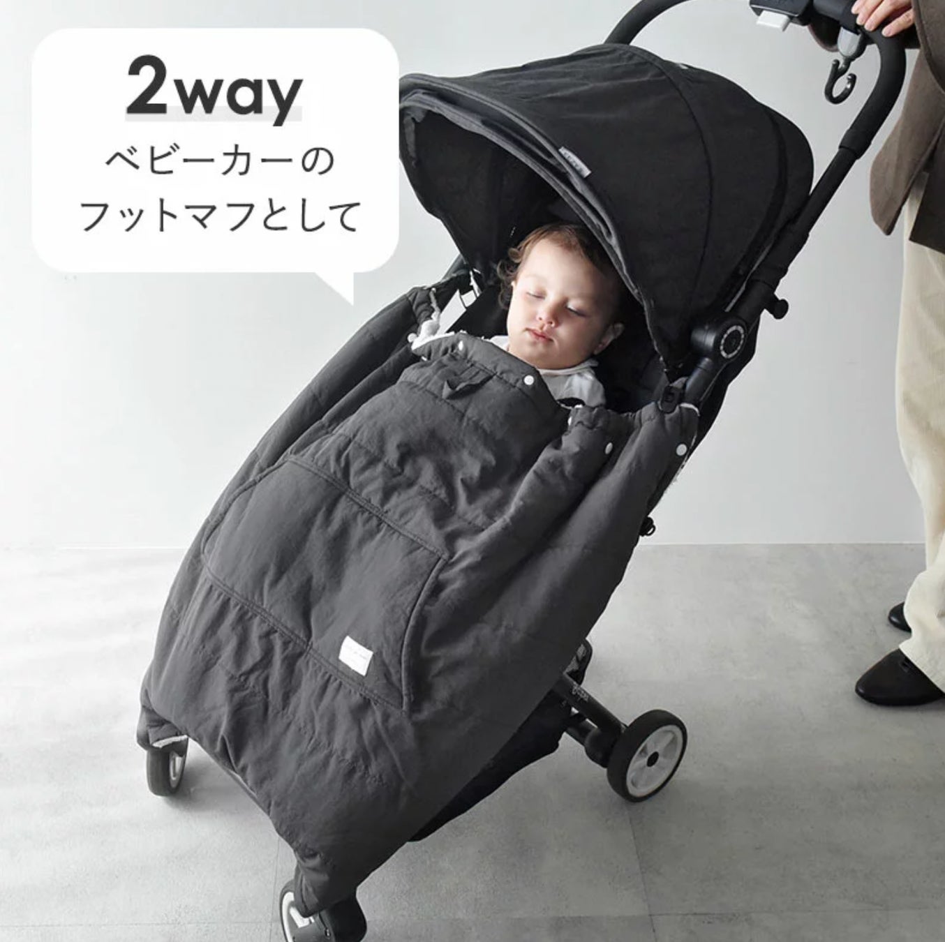 ベビーカーに取り付ければ、身体をすっぽり覆うフットマフに。