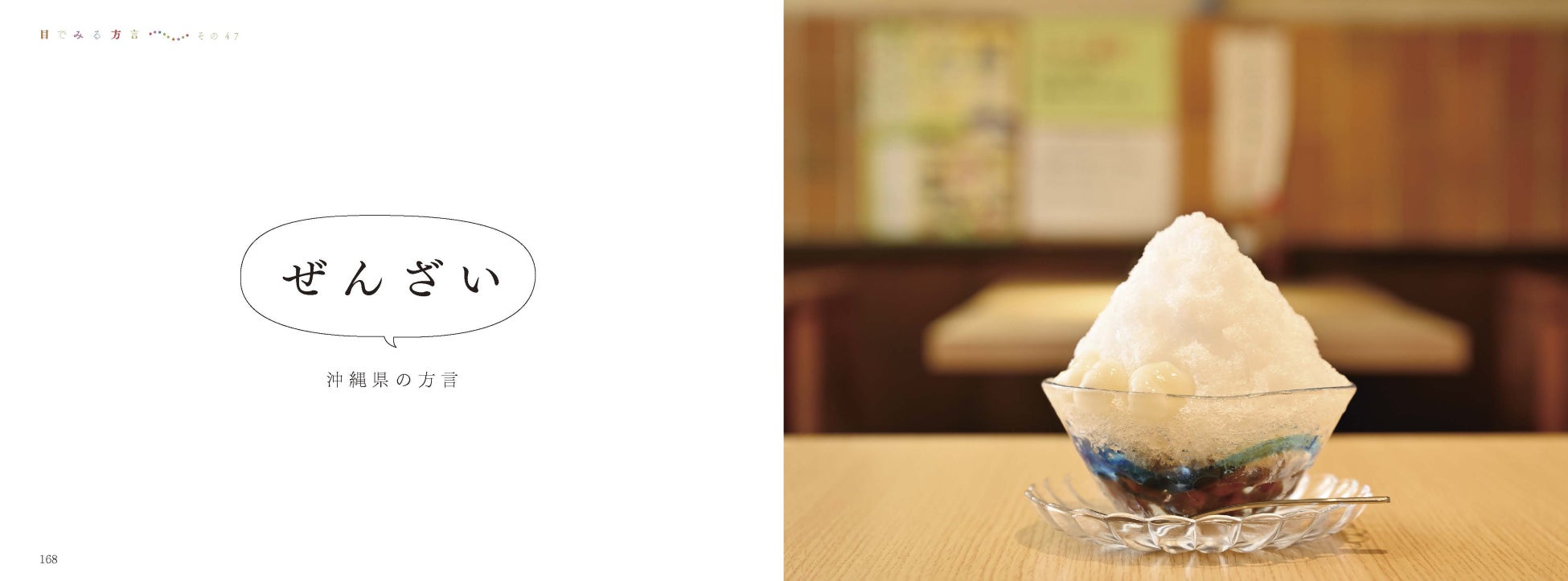 一例を挙げると、沖縄県の方言として「ぜんざい」を取り上げています。このことばに対応する写真は、一見すると「かき氷」です。それは、沖縄の「ぜんざい」が「かき氷スタイル」で提供されるが故なのですが、他県民からすると、このことばと写真の差に「え?」と思うのではないでしょうか。このギャップを楽しんでもらえたらなと思っています。