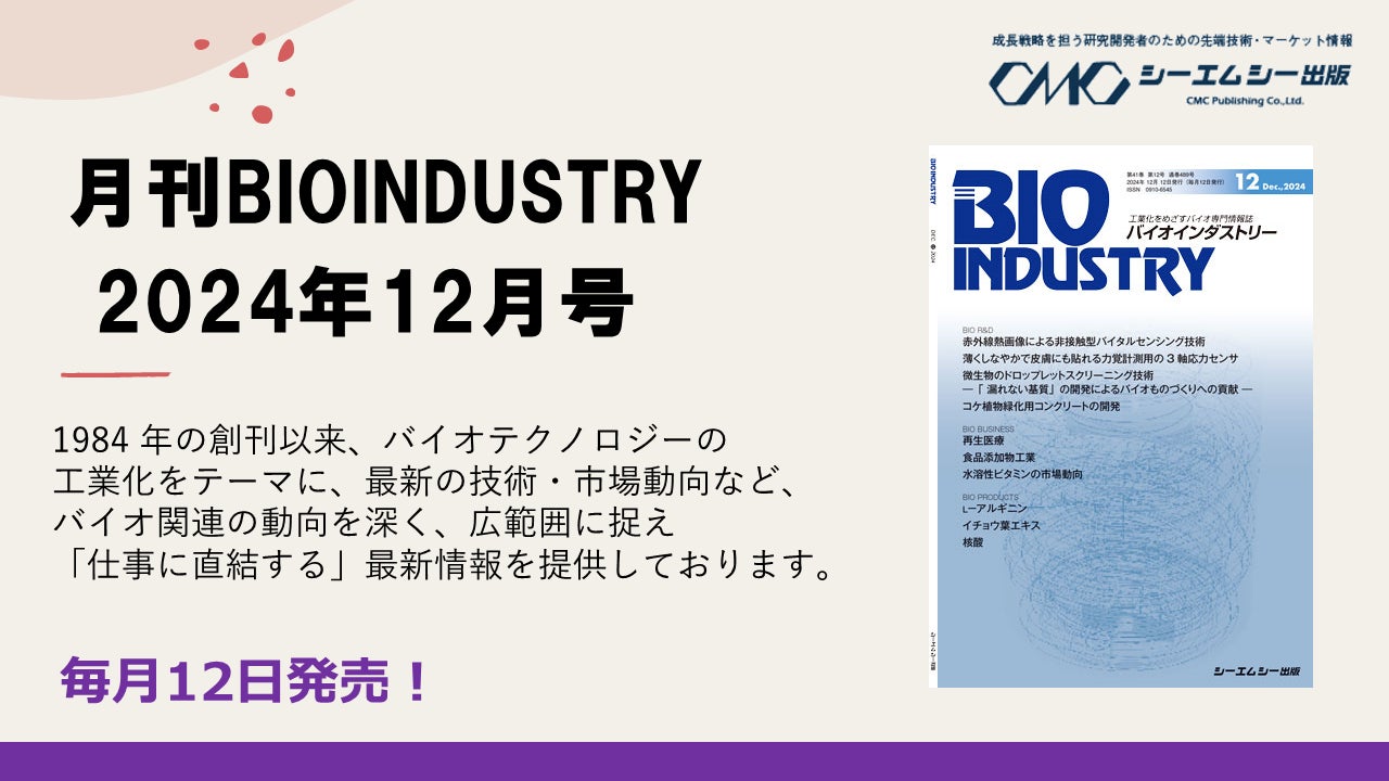 株式会社シーエムシー出版(本社:東京都千代田区、代表:金森洋平)は、雑誌『月刊BIOINDUSTRY 2024年12月号』を12月12日に発売します。紙媒体の「雑誌版」は税込6,050円(本体価格5,500円+税)で、当社ECサイト及び全国の書店でご注文を受け付けております。また同時に「電子版」も、電子書籍販売サイト「CMCeBook」にて税込5,500円(本体価格5,000円+税)で販売します。