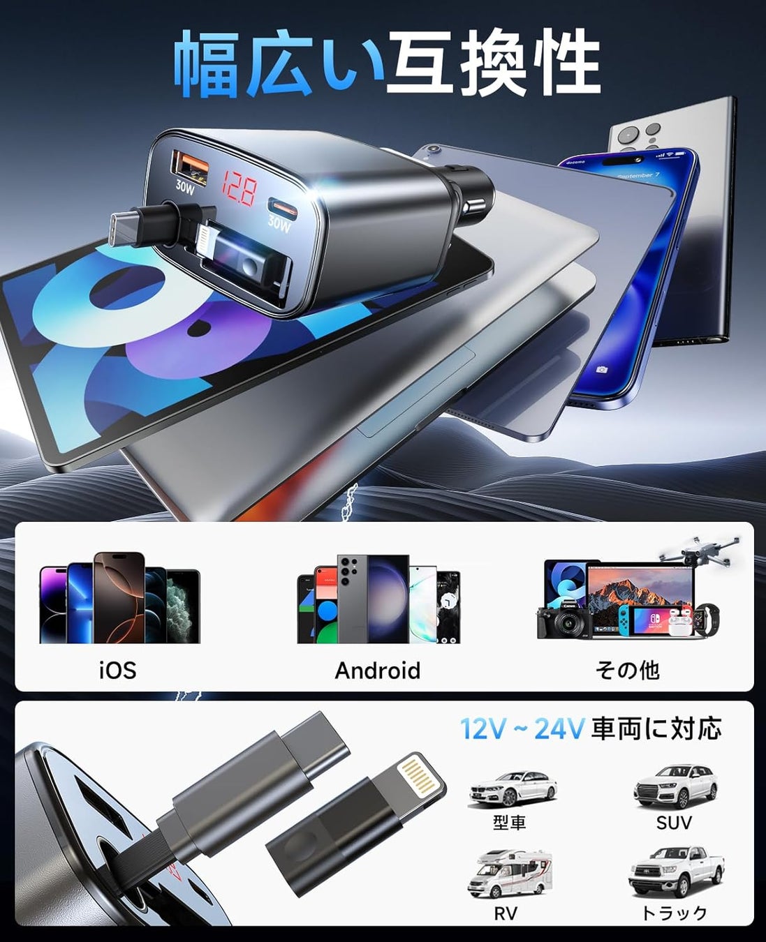 このシガーソケット USBは、iOSおよびAndroidデバイスに対応し、12-24Vの様々な車種にも適用可能で、乗用車からトラック、RVまで幅広い車種で使用できます。スマートフォン、タブレット、iWatch、ドローン、カメラ、ゲーム機など、多岐にわたるデバイスへの充電に対応し、1つで全ての充電ニーズに応える汎用性を備えています。