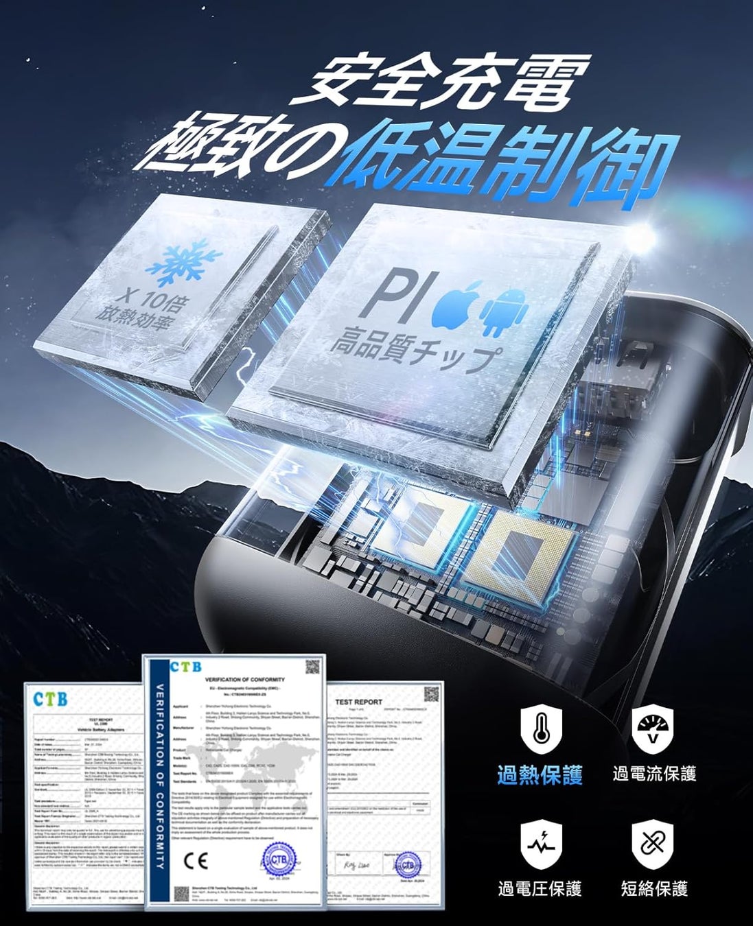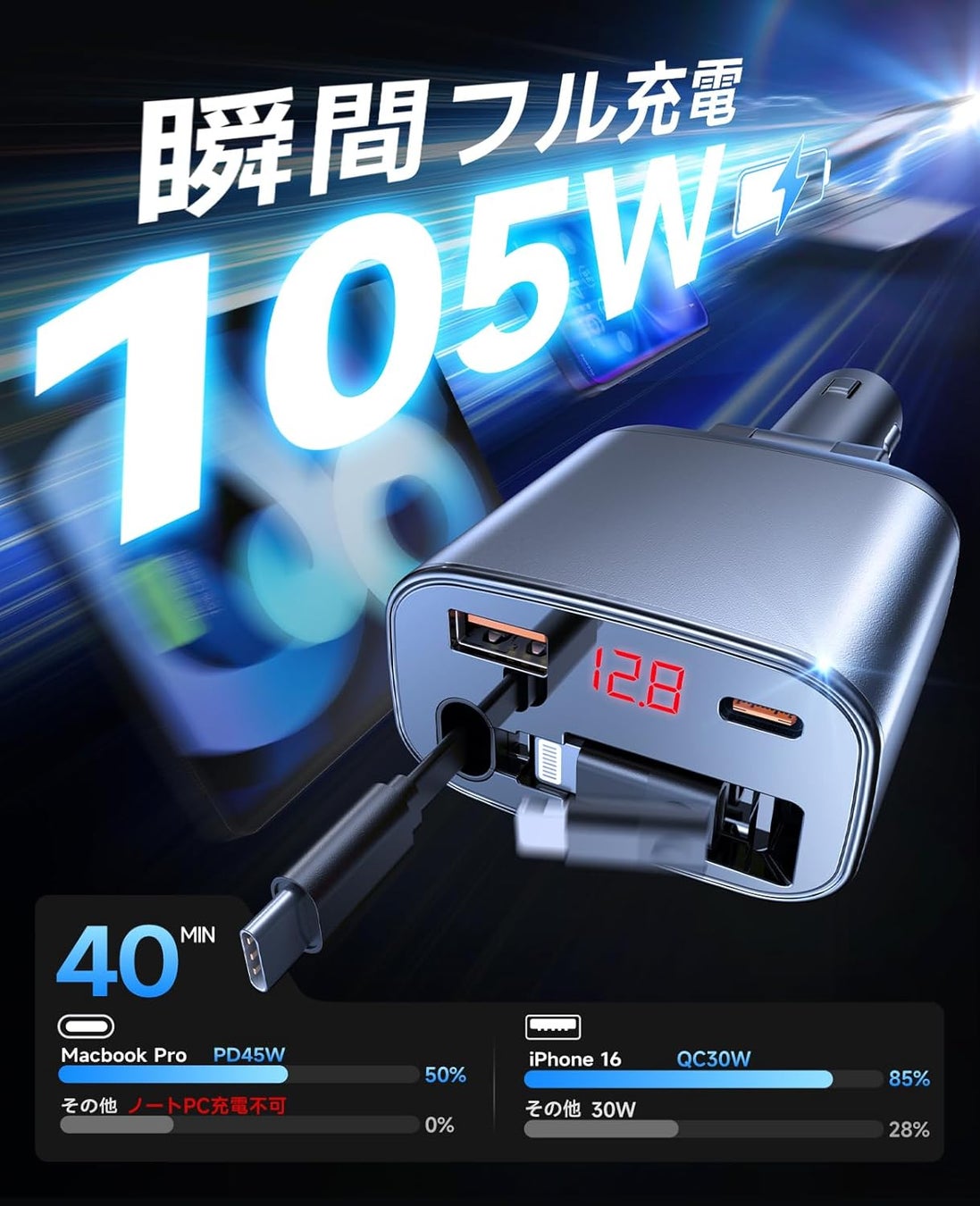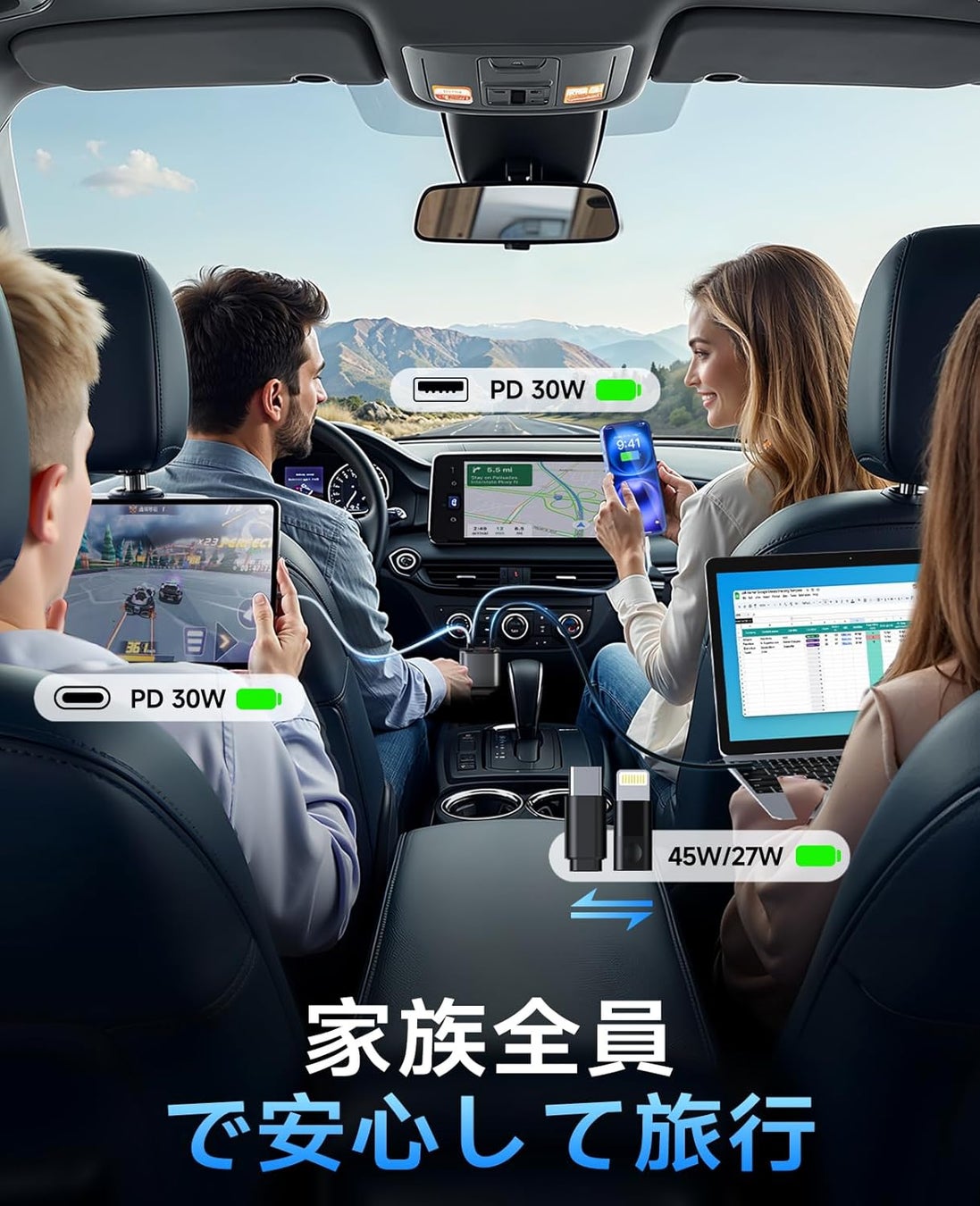 わずか45分でiPhone16を85%まで急速充電し、ノートPCも約50%まで充電可能です。他の多くの車載充電器では実現できない、ノートPCへの高速充電機能を提供します、通勤やビジネスシーンでの充電ニーズに応えます。
