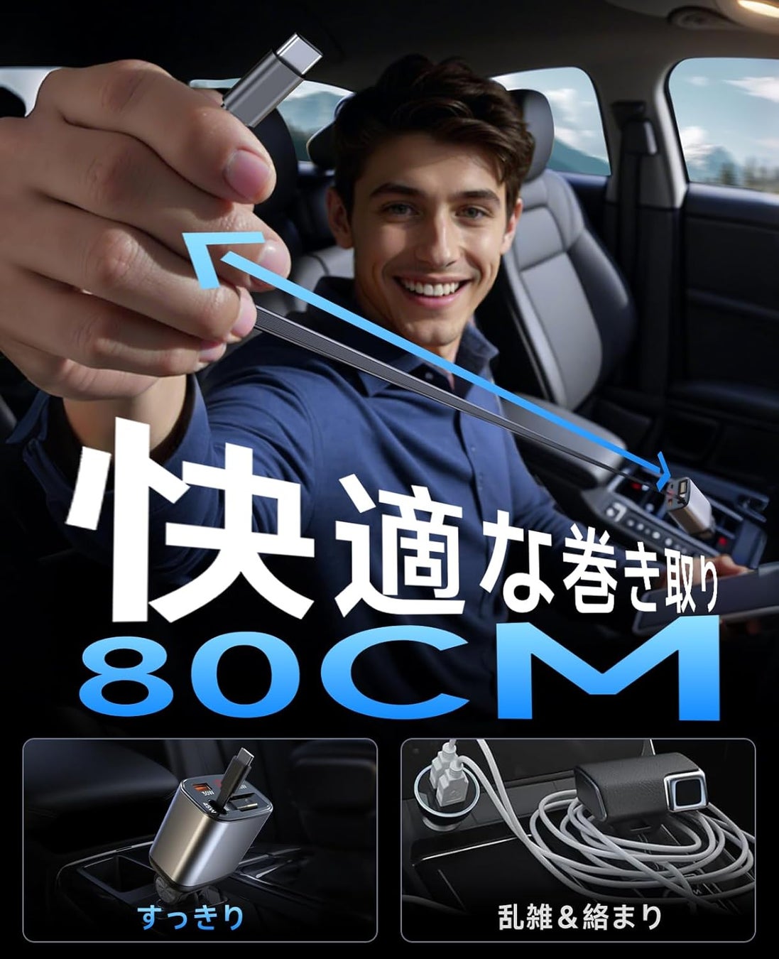 このシガーソケット USB充電器は、伸縮式で変換可能なデータケーブルを搭載し、Type-CおよびUSB端子を備えることで、最大3台のデバイスを同時に高速充電可能です、家族や友人とのドライブがより楽しいものになります。