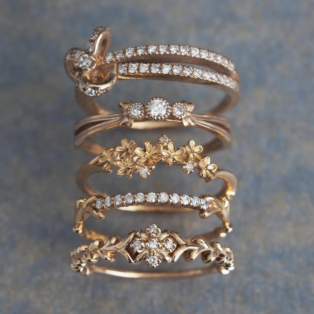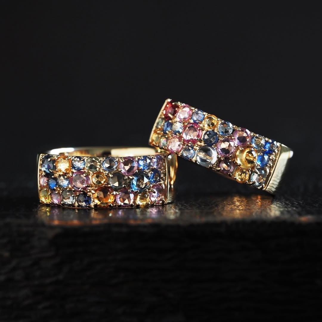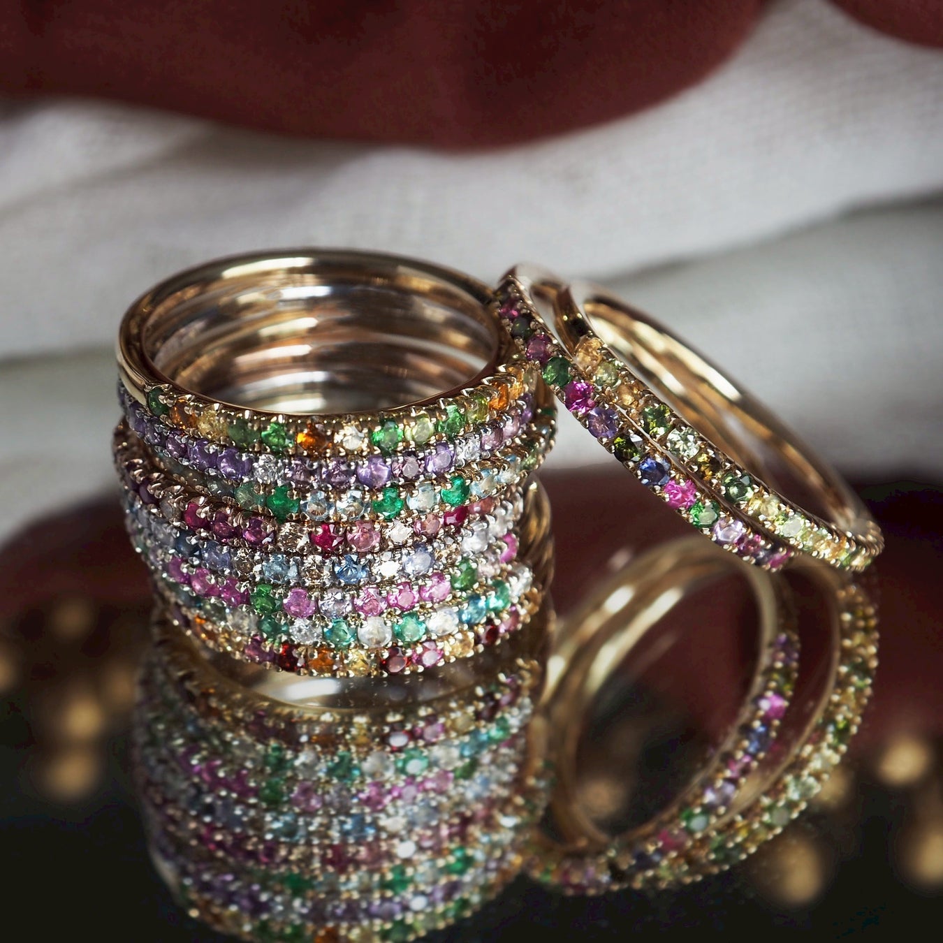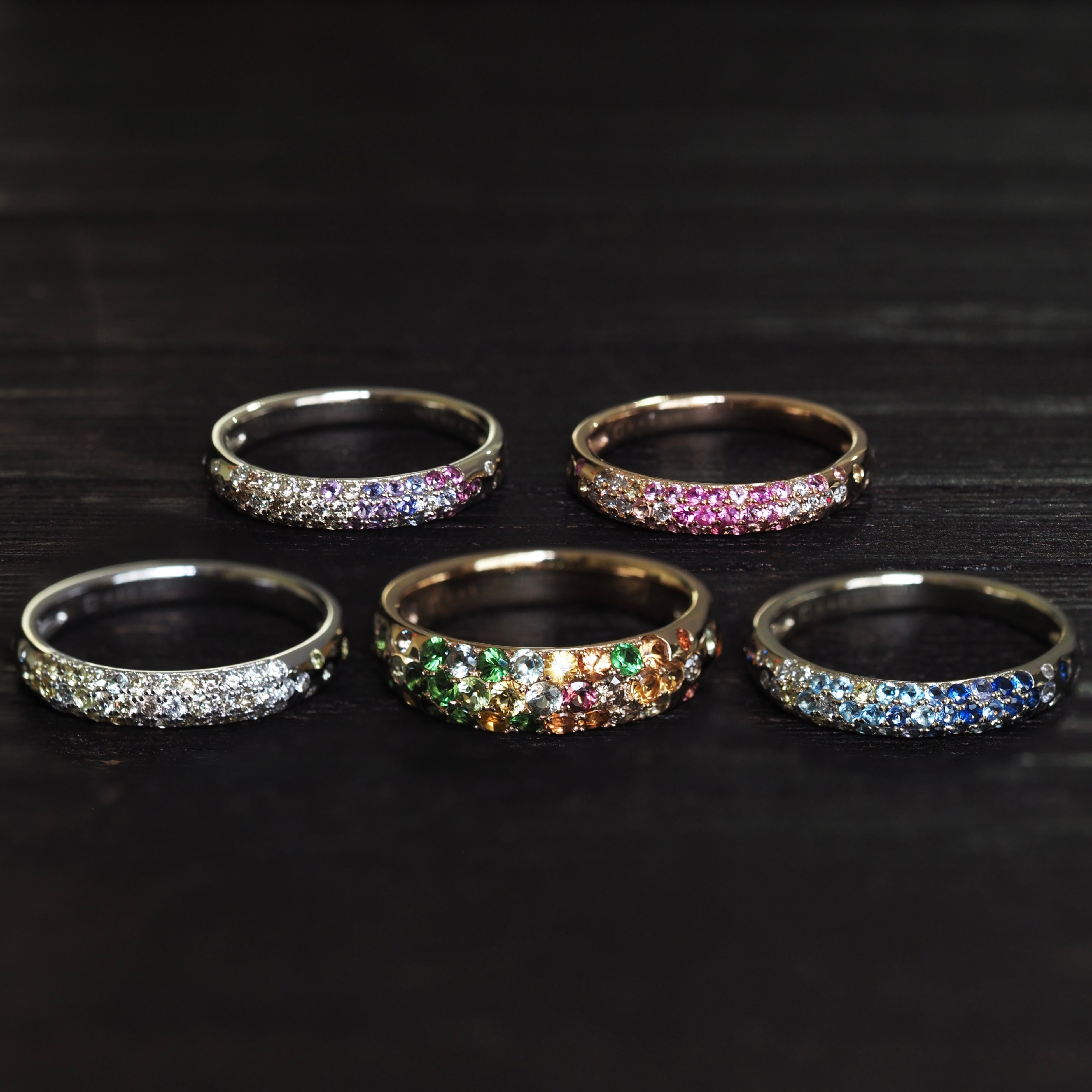 職人による繊細なパヴェが印象的なMiraは、リングの両サイドに施された石留めが、宝石がこぼれ落ちるような輝きを演出します。これまでCaravanやPOP UP SHOP限定で展開していたシリーズが、今回は2種類の幅感と襲色目のグラデーション配色で登場します。