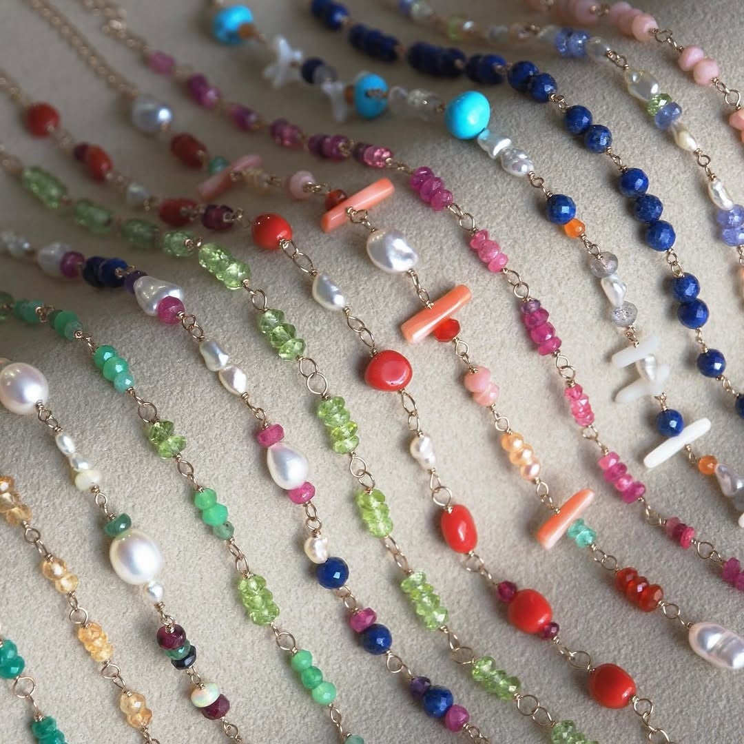 秋の始まりに登場した「Shank-Wrapped Bracelet(シャンク巻きブレスレット)」は、長袖の季節の装いに自然に寄り添うデザインです。袖口からさりげなく覗くカラフルな彩りが、秋冬のコーディネートに軽やかさと華やぎを添えます。細めの袖口には服の上から重ねるスタイルもおすすめです。