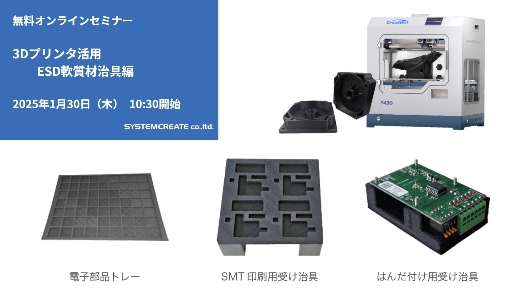 株式会社システムクリエイト(本社:大阪府東大阪市荒本新町、代表:川上正義)は、2025年1月30日(木)10:30に、無料オンラインセミナー「3Dプリンタ活用 ESD軟質治具編」を開催いたします。