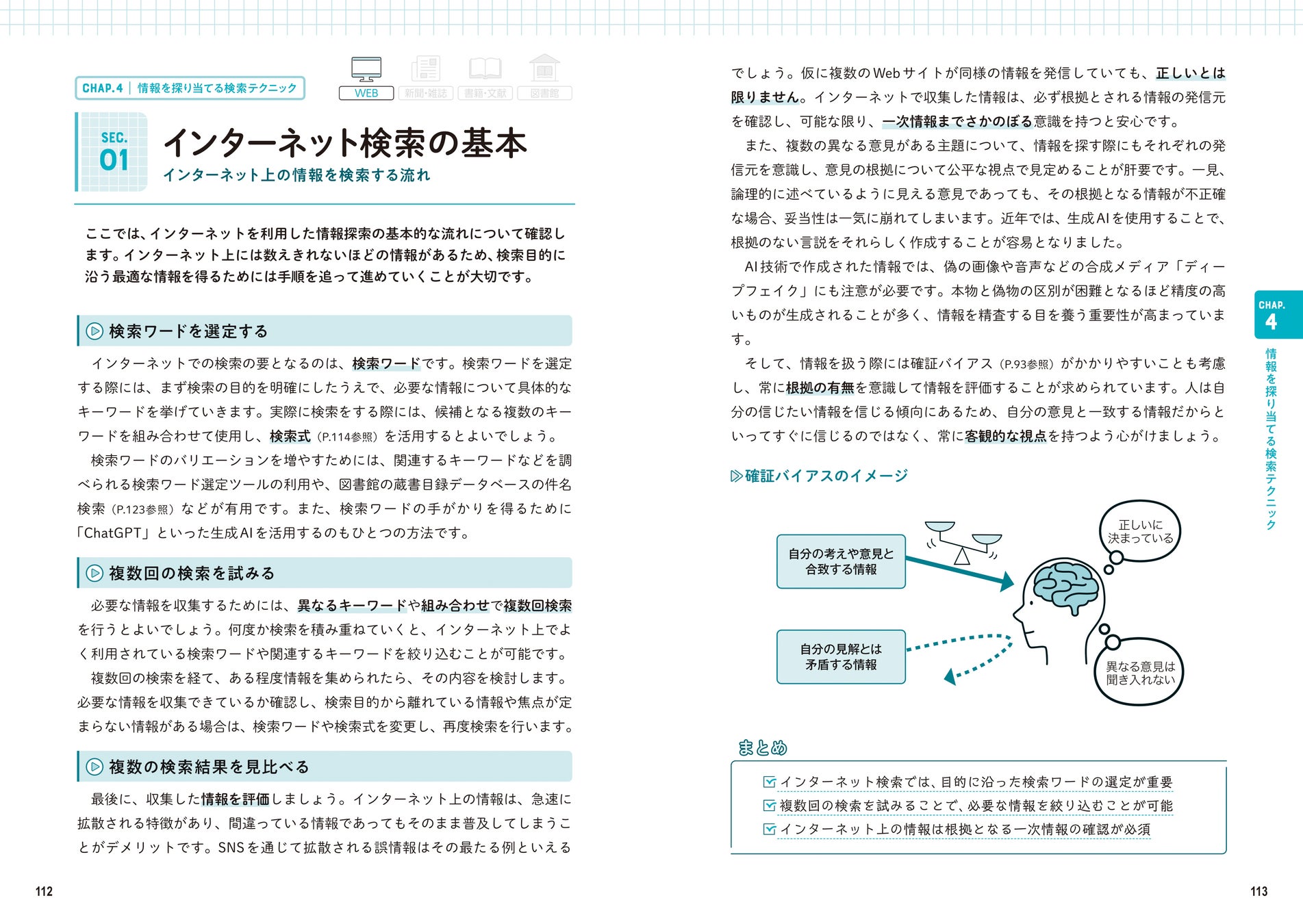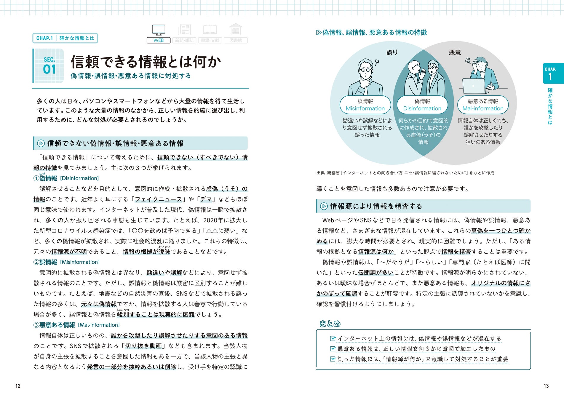 情報の信頼性はどのように調べればいいのでしょうか。一次情報か二次情報か、発信元が国や公的機関、研究者などであるかといった基準によって、信頼できるかどうかを見極める必要があります。本書では、信頼できる情報とは何かについて詳しく説明しています。