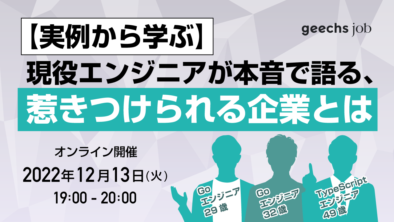 ギークス株式会社(本社:東京都渋谷区、代表取締役CEO:曽根原 稔人、以下ギークス)は、2022年12月13日(火)19:00~20:00にて、エンジニア採用に悩む企業の人事・採用担当者に向けたオンラインセミナー「実例から学ぶ、現役エンジニアが本音で語る、”惹きつけられる企業”とは」を開催することをお知らせします。