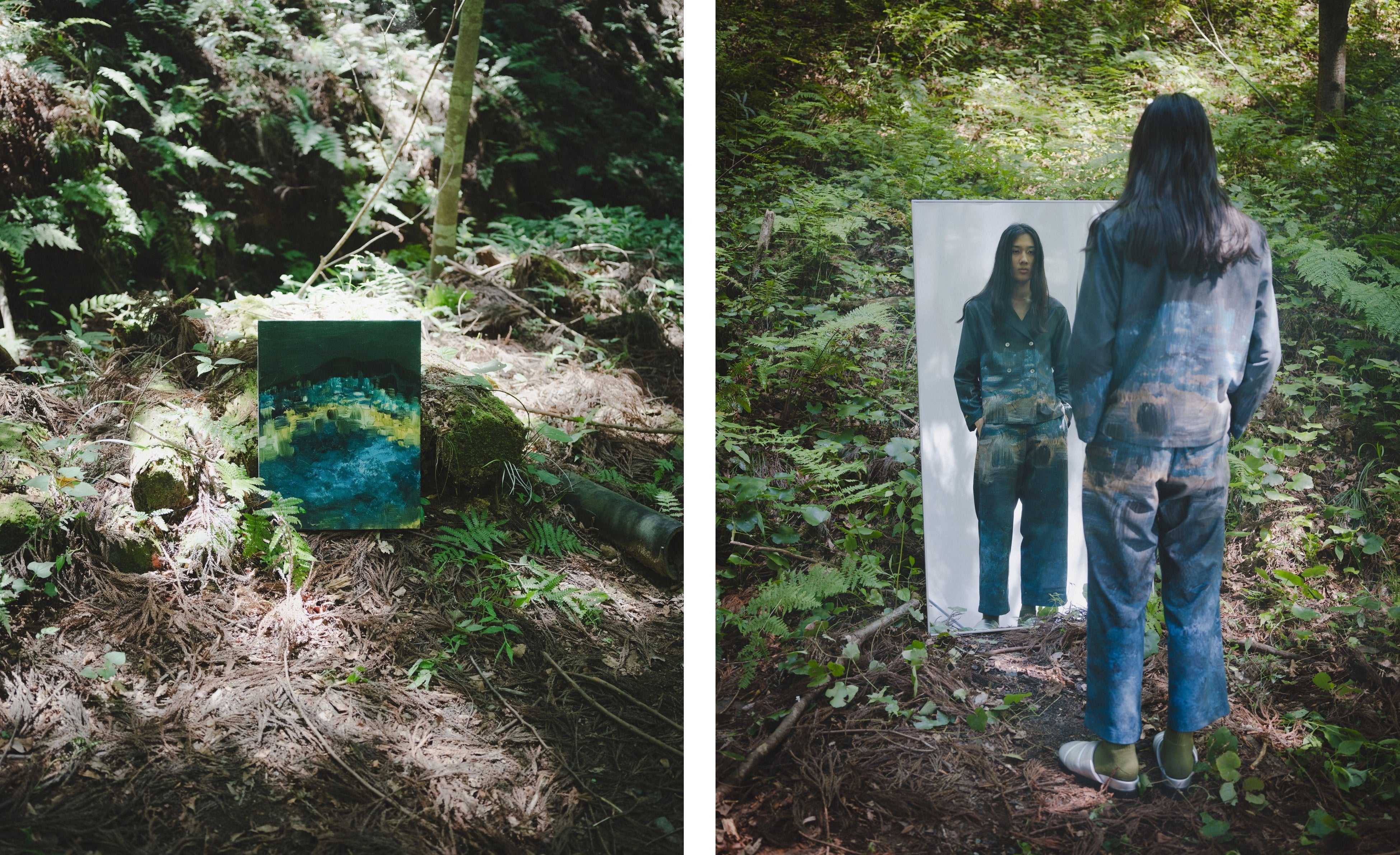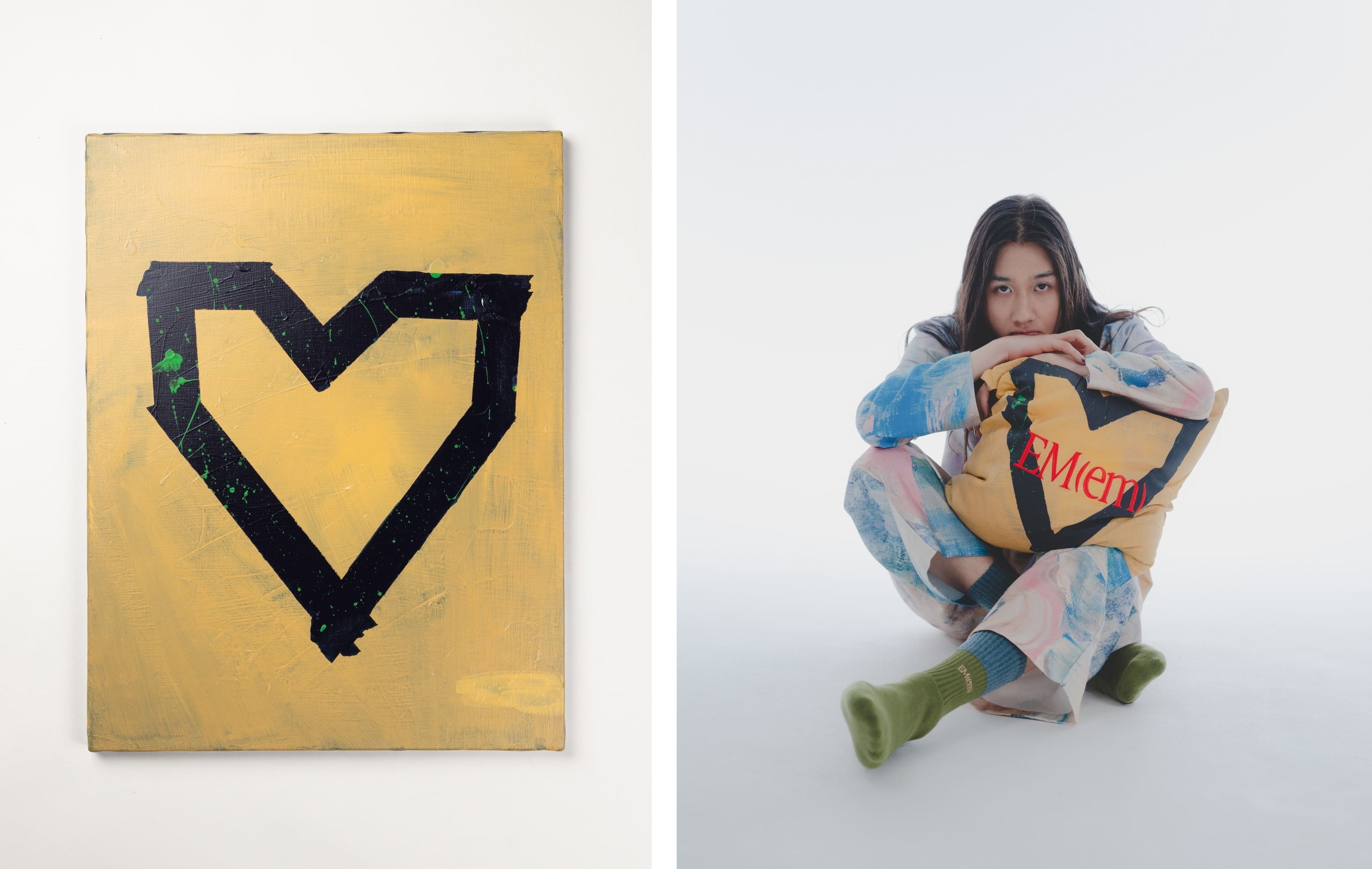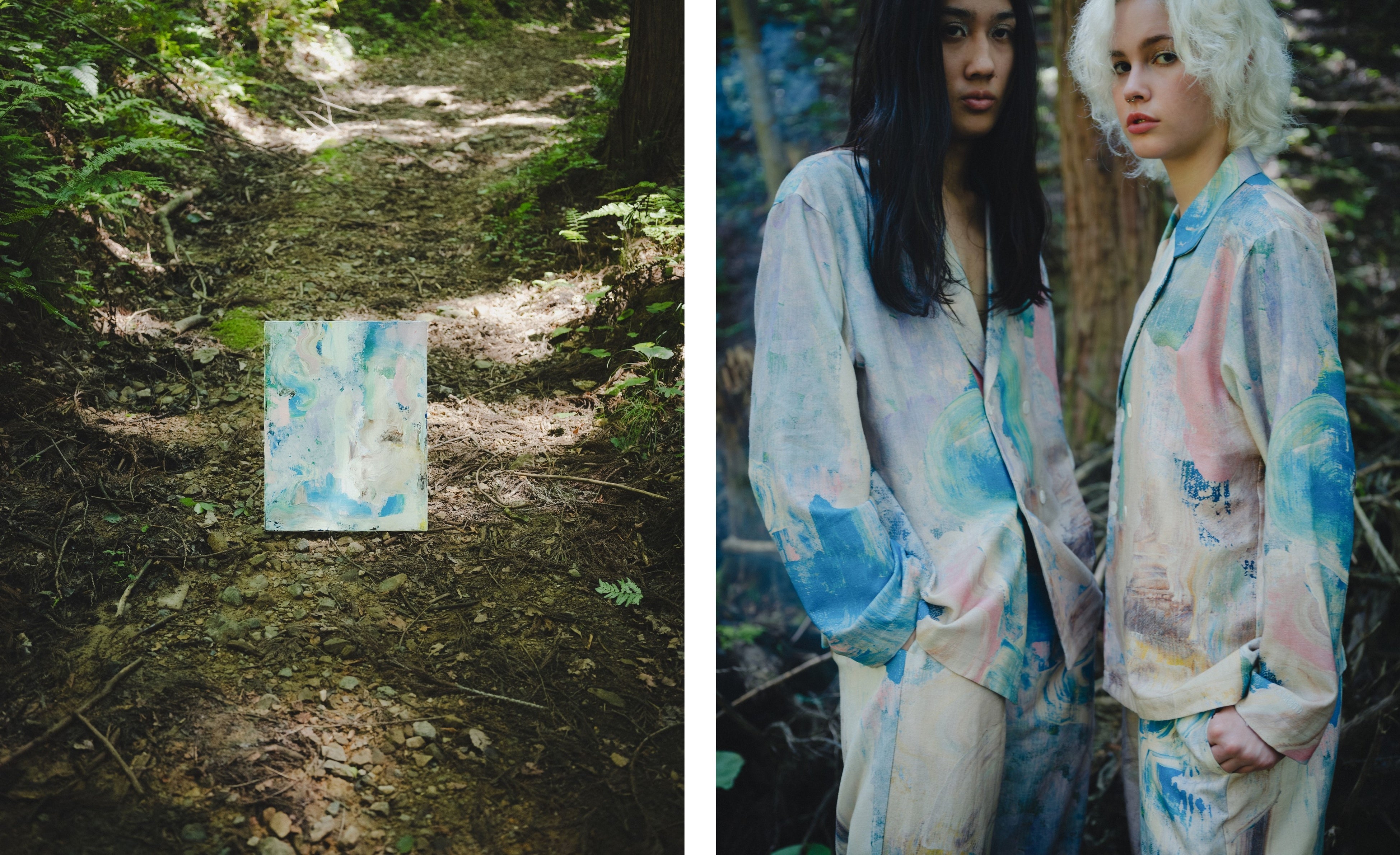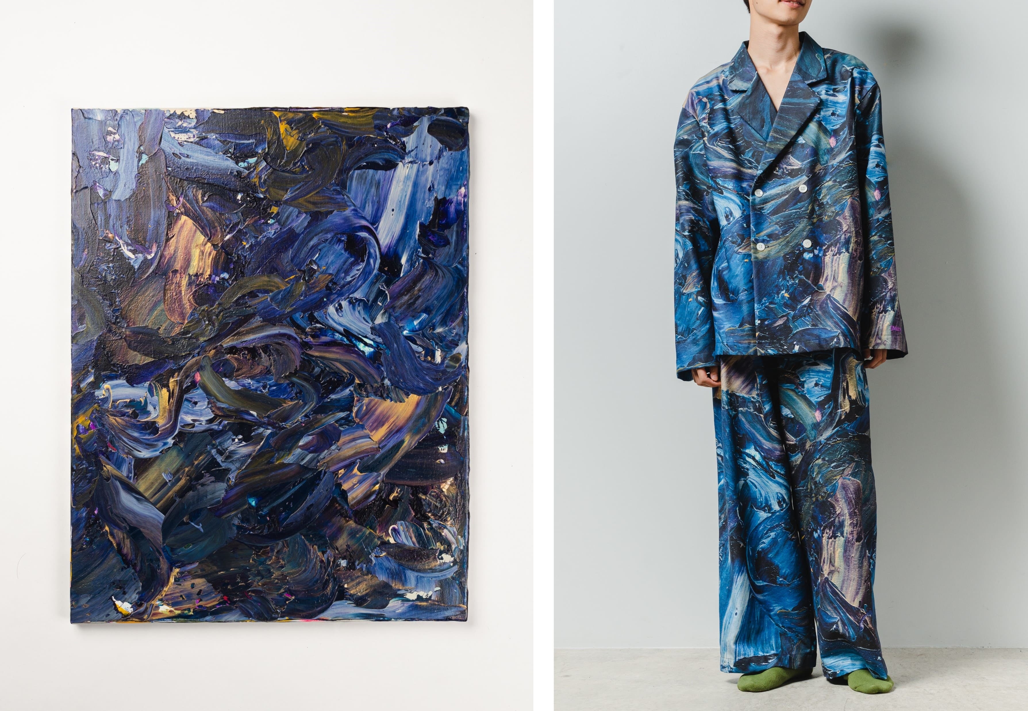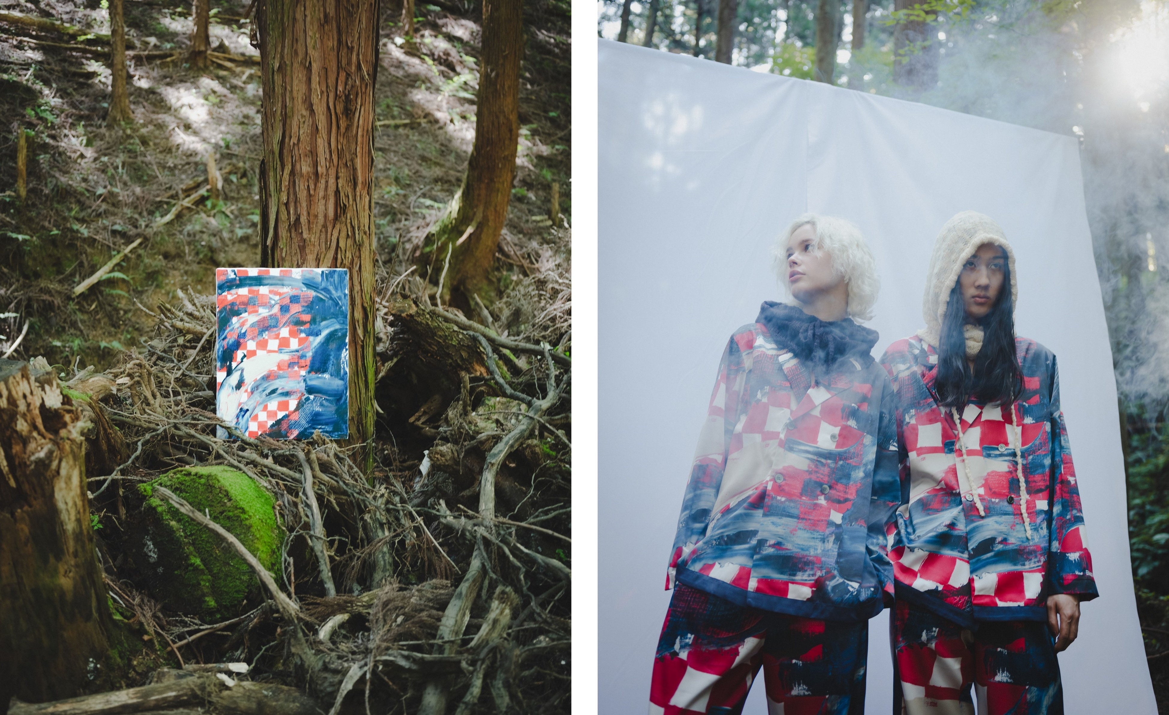 EM(em)AW コレクションのテーマは『Wonder』です。大社カリンが見た夢から着想を得て描いた8枚の抽象画を、ルームウェアやクッションカバーに仕立てました。