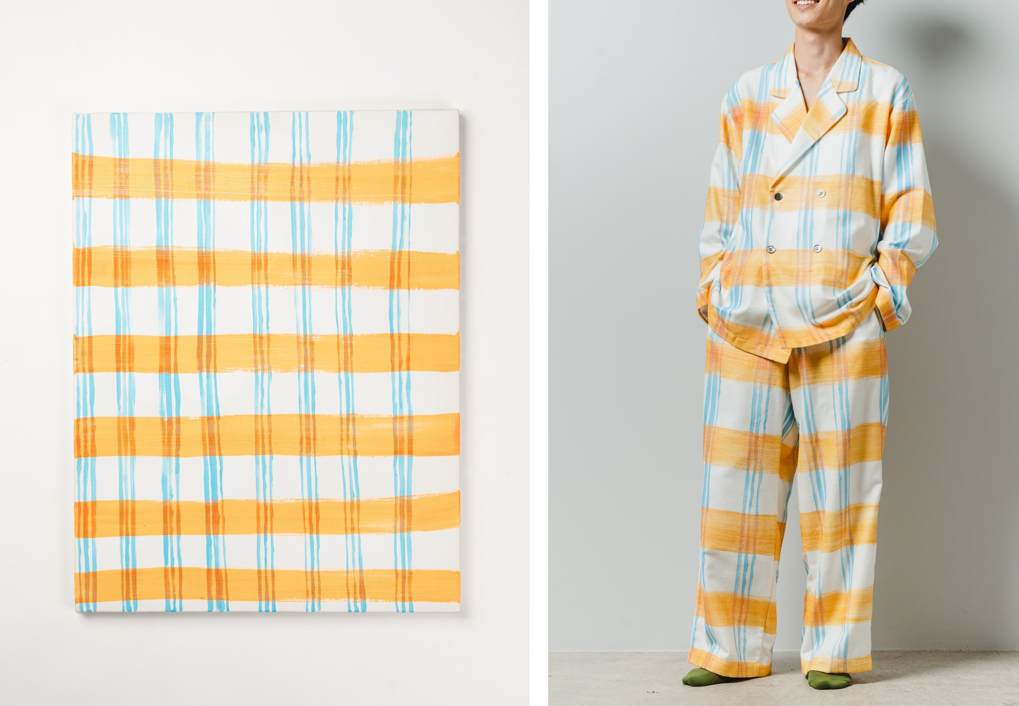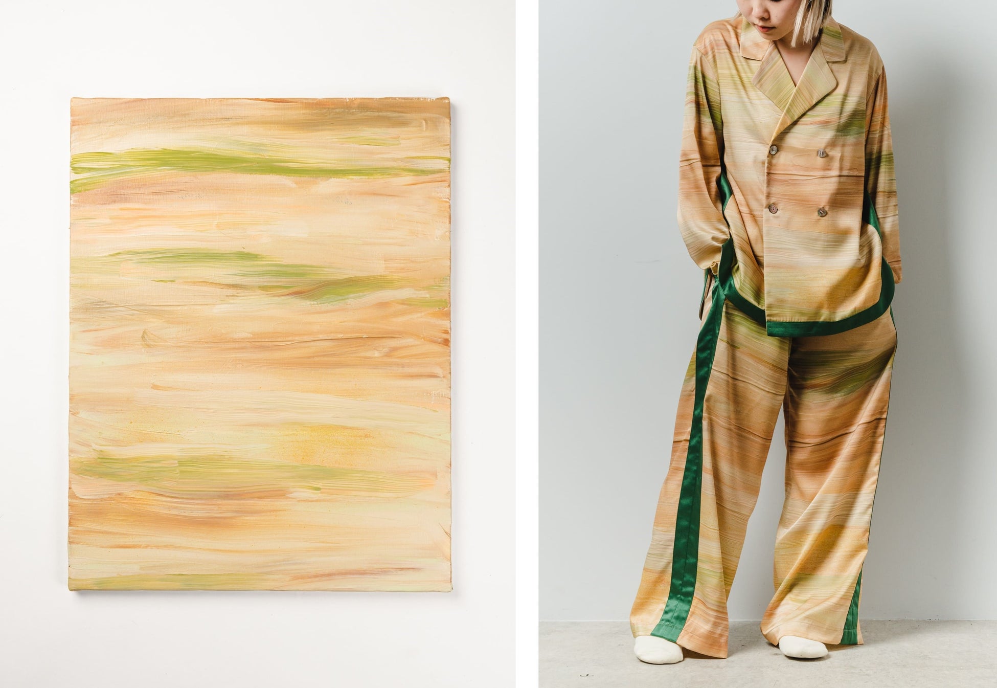 目を引く、唯一無二の絵柄は、画家・大社カリンが描いた抽象画が元となっています。原画をスキャンし、アクリル絵の具の色味やかすれ具合まで忠実に再現したシティパジャマは、まさに着るアート。なんでもない、休日前の夜を特別にする一枚となっています。