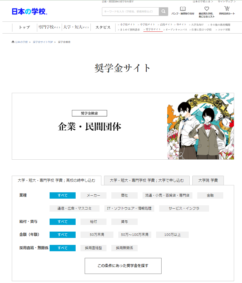 奨学金サイト「企業・民間団体の奨学金」:https://school.js88.com/shogakukin/search?search_kind=1