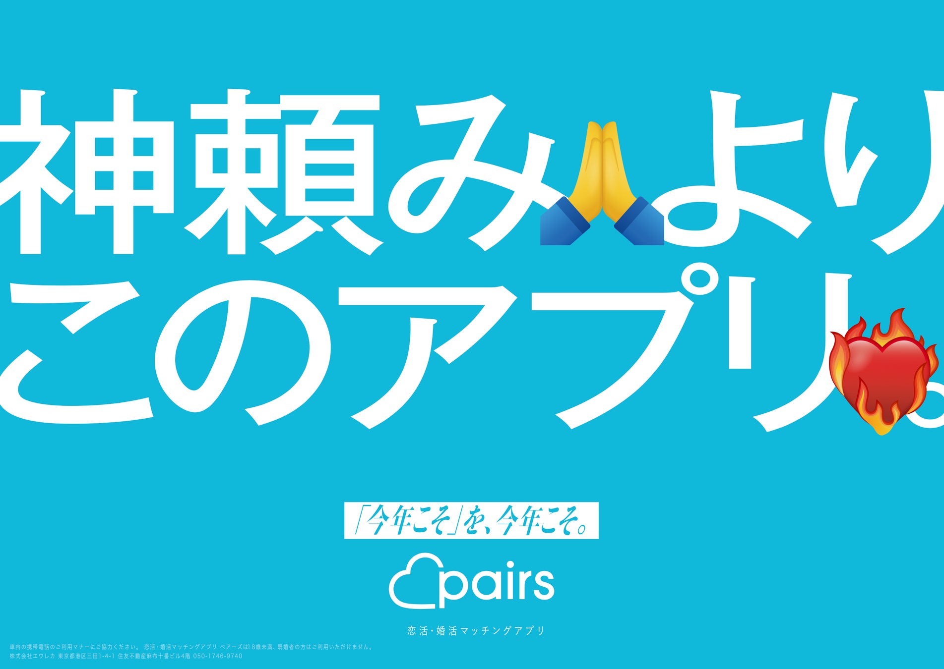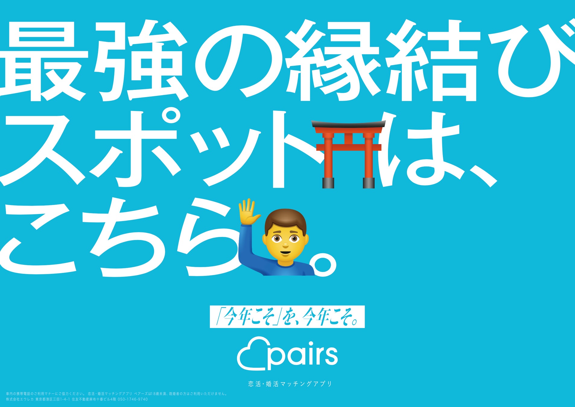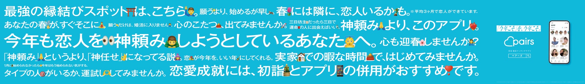 2023年お正月より、新宿、渋谷、品川、新大阪などの主要駅および電車内や、初詣の定番である川崎大師(神奈川県)、熱田神宮(愛知県)、伏見稲荷大社(京都府)、住吉大社(大阪府)などの神社にて様々な屋外広告を展開します。広告コピーは「神頼みよりこのアプリ」や「最強の縁結びスポットは、こちら」など新年や初詣にちなんだ内容になっており、恋人探しに向けて今年こそ一歩踏み出したい方を応援する思いを込めました。
