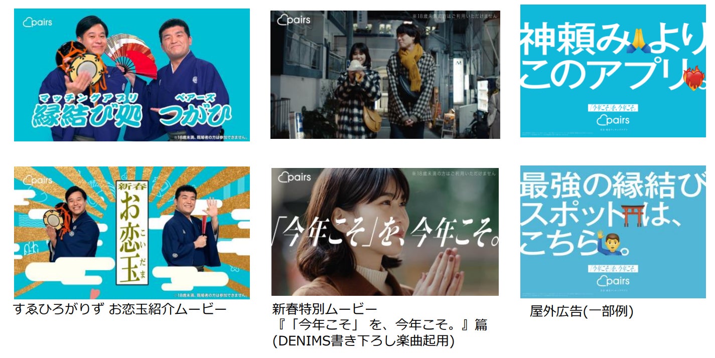 また広告展開として、1月1日(日)より、人気ロックバンドDENIMSによる描き下ろし楽曲を使用したムービーや、新年の恋人探しを応援するメッセージを込めた広告を、主要駅・電車内の交通広告や有名神社、TikTok等のSNSで展開します。(※放映・掲出期間は場所により異なります。)