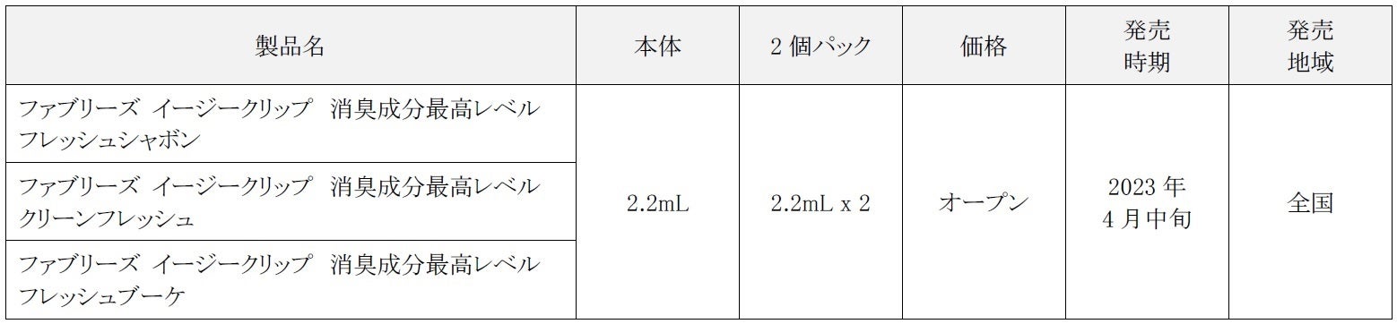 「ファブリーズ イージークリップ 消臭成分最高レベル*1」は、「フレッシュシャボン」「クリーンフレッシュ」「フレッシュブーケ」の3種類の香りのラインアップを、消臭成分を最高レベル配合した*1“金のファブリーズ”の特長を表現した金の製品パッケージで販売いたします。