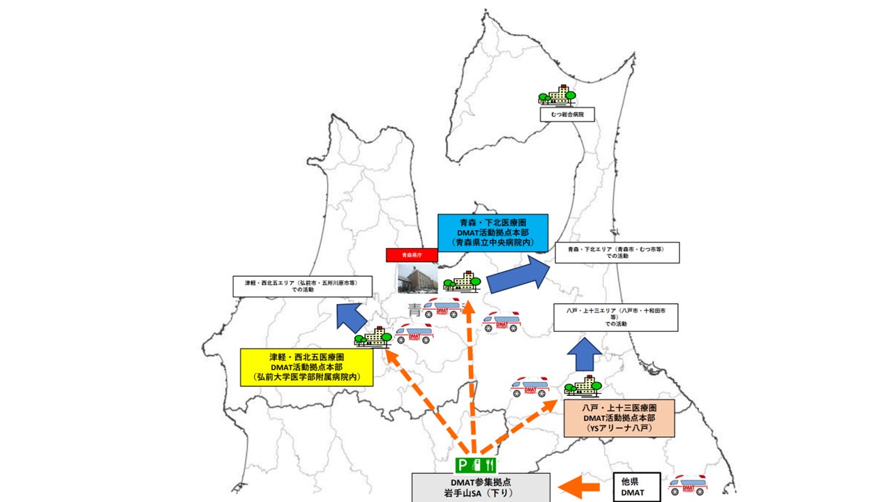 Buddycom活用範囲:青森県庁DMAT調整本部、弘前大学医学部附属病院、八戸地区(病院外)、青森県立中央病院