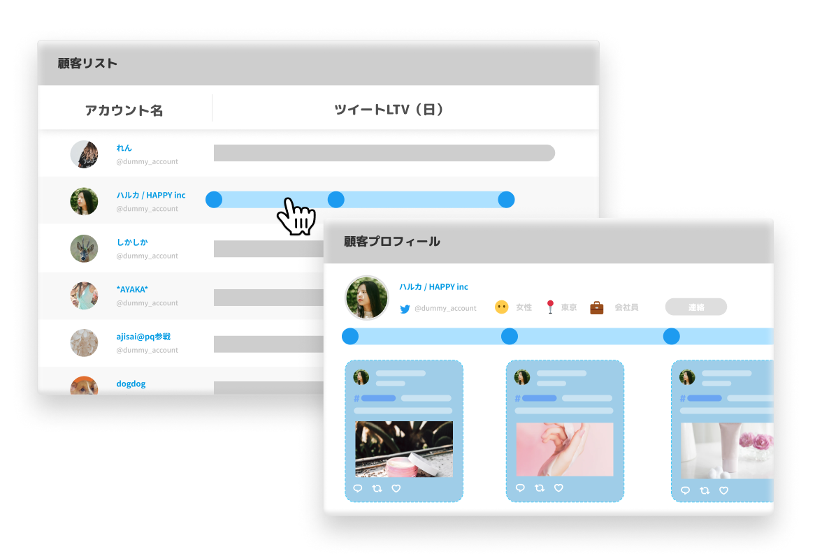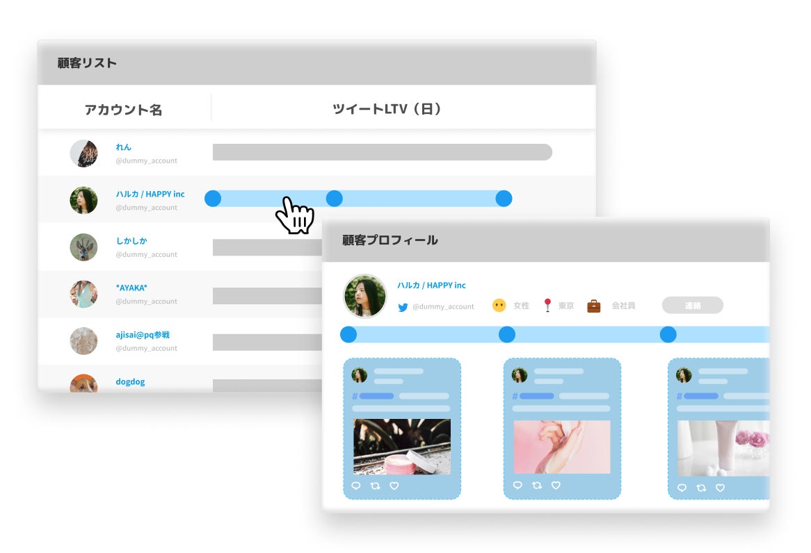 Twitter上のユーザ情報や投稿から生活者をスクリーニングし、自社顧客の発見・CRM化、オンライン定性調査のアンケートやインタビューを活用して生活者の購買意識・購買行動を深掘りしていきカスタマージャーニーを作成する次世代サービスです。