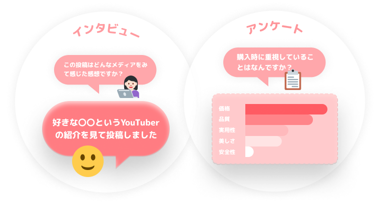 ● SNSで投稿された内容をベースに、ブランド顧客に購入するきっかけになったことや、興味を持ったが購入しなかった理由、購入したが継続せずにやめてしまった理由、購入した後の利用シーンなどを、アンケートやインタビューを通して更に深ぼることができます