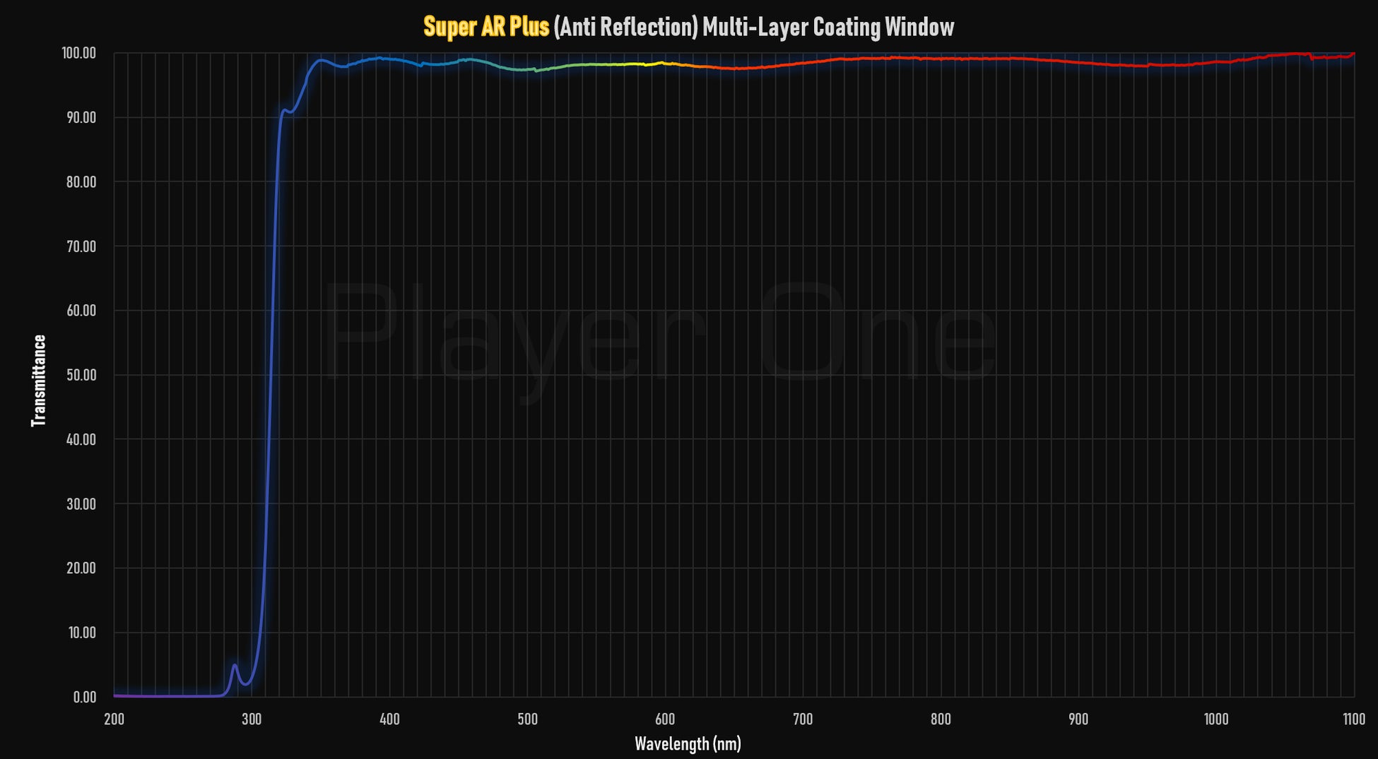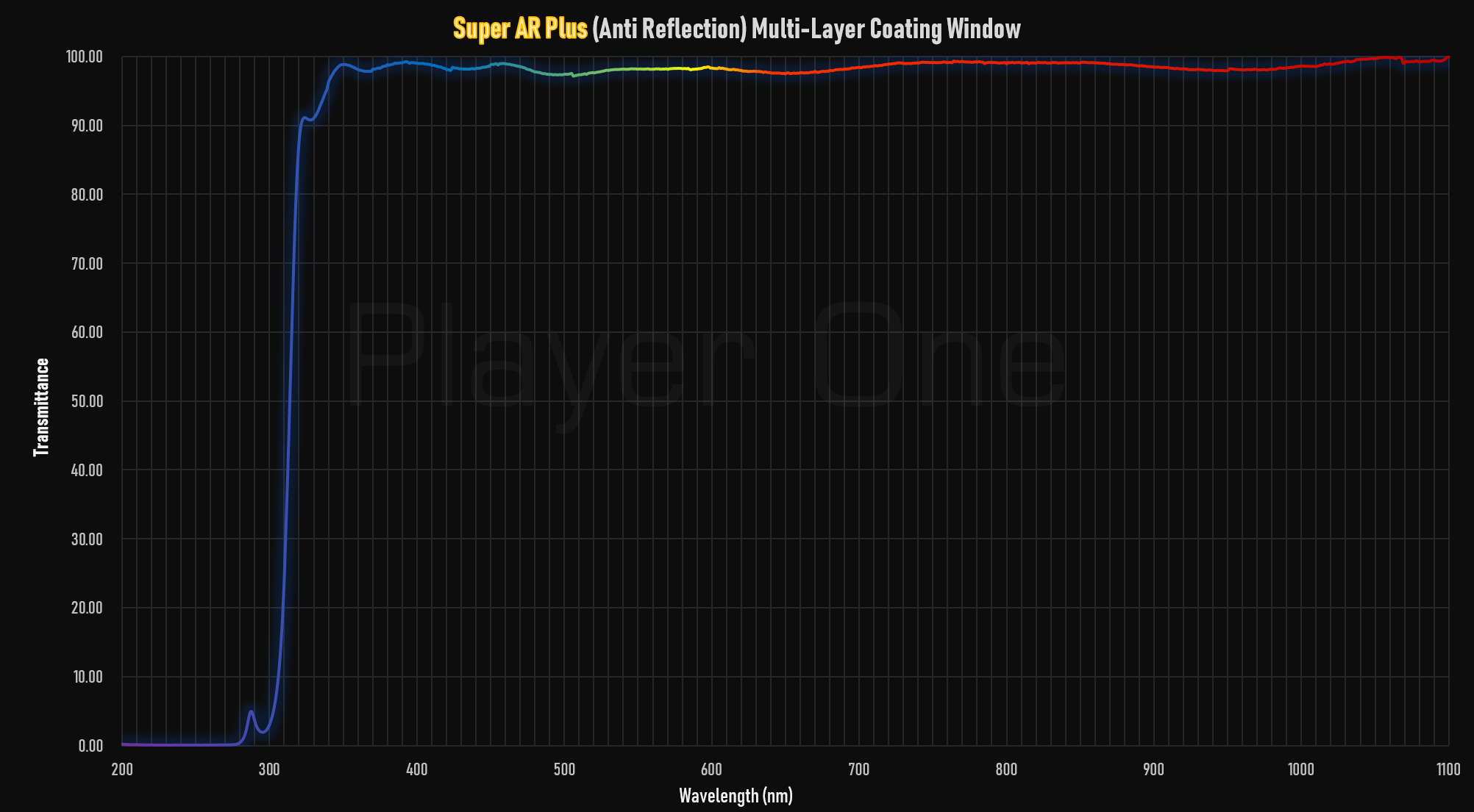 310nmから1100nmまで全域で非常に透過率が高く低反射のコーティング「スーパーAR+」を保護ガラスに採用しています。