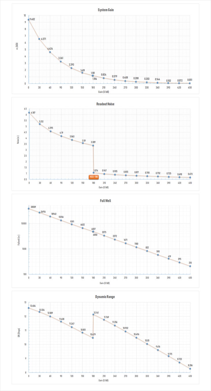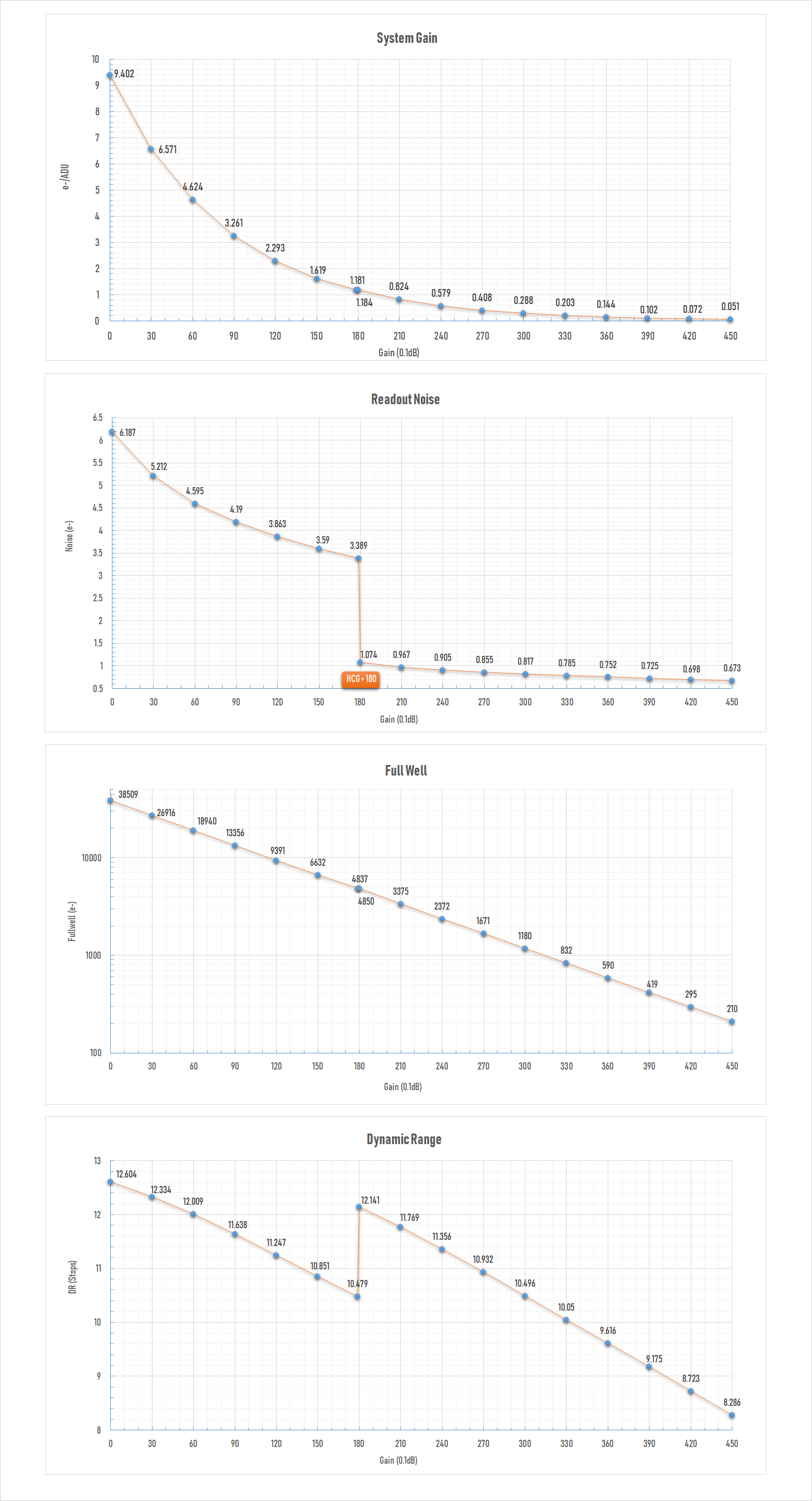 ・HCG(ハイコンバージョンゲイン)モードに対応しており、ゲインが180以上になると自動的に専用の回路に切り替わり、読み出しノイズを抑えます。最小で0.67e-という驚異的な低読み出しノイズを実現しています。