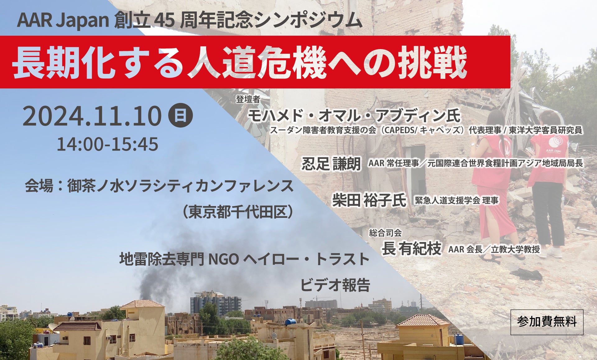 AAR Japan[難民を助ける会]は11月10日(日)、創立45周年を記念して、シンポジウム「長期化する人道危機への挑戦」を御茶ノ水ソラシティカンファレンス(東京都千代田区)で開催いたします。参加無料。