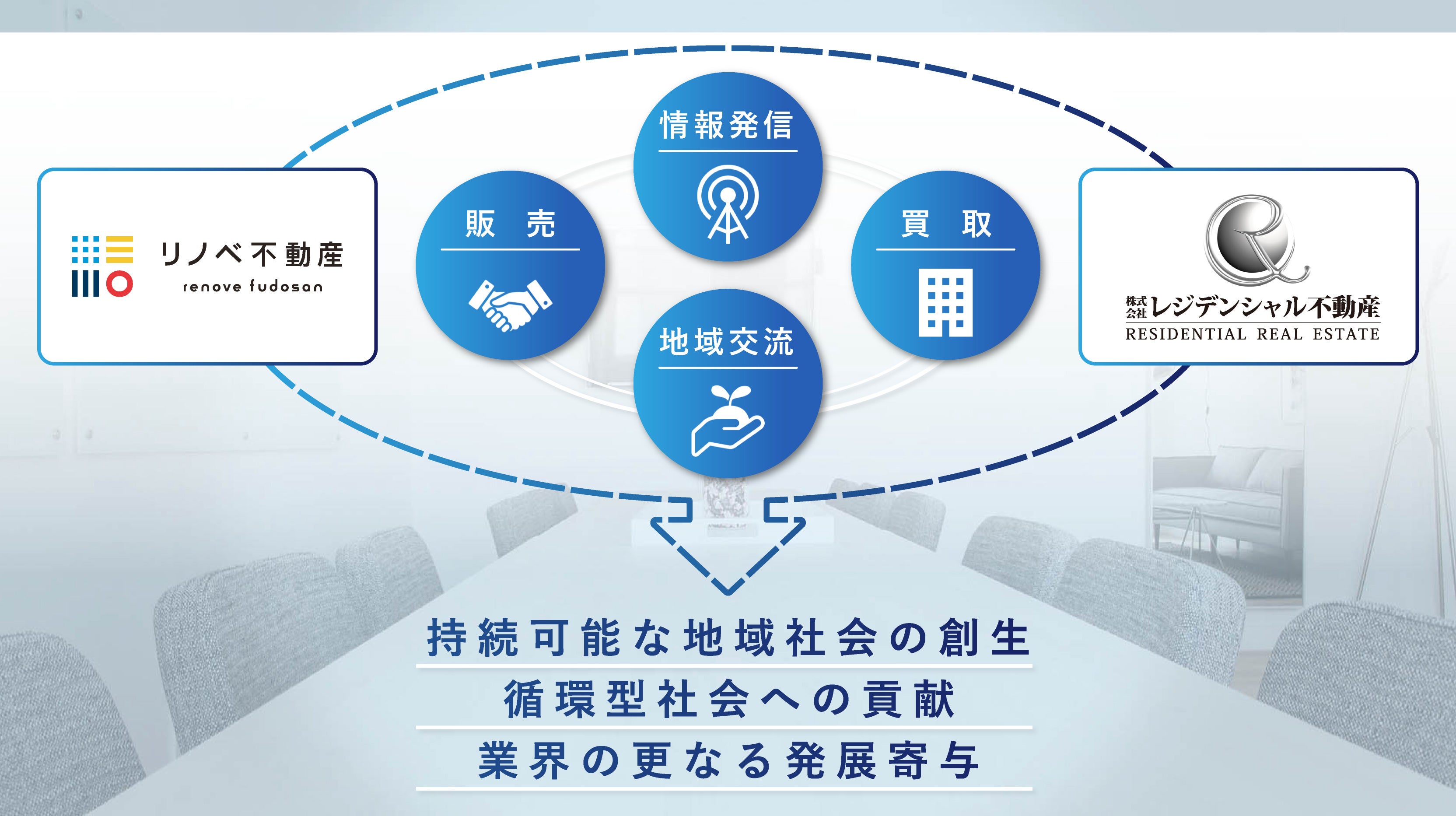 双方の強みとは、リノベ不動産の強みである、中古住宅特有の複雑な事業プロセスをテクノロジーの活用によりDX推進し、全国の事業者へプラットフォーム展開するブランド力と、レジデンシャル不動産の強みである、物件の安定供給力です。