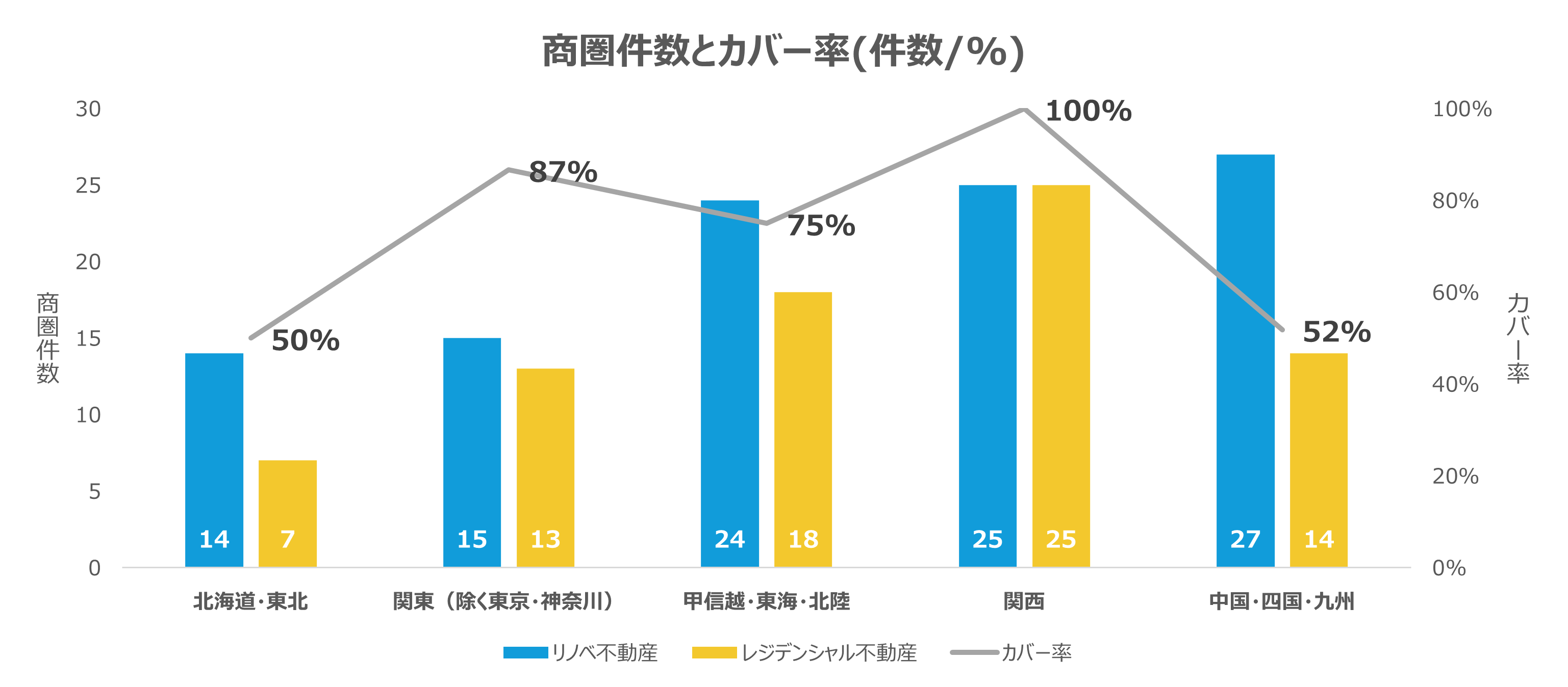 リノベ不動産では全国に約200拠点のネットワークを保有しておりますが、レジデンシャル不動産の戦略エリアとのカバレッジは73%となっております。