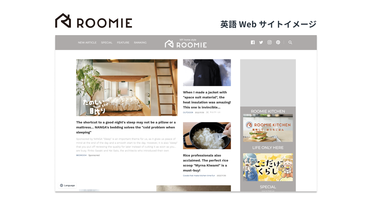 ROOMIE は、常に居心地のいい、リラックスした「おうちスタイル」を志向するみなさまに、自分らしい・新しいライフスタイルを届けるメディアサイトです。月間ページビュー数 13,300,000 PV の ROOMIE が発信するコンテンツは、家電・生活用品といった生活のお役立ち情報はもちろん、サコッシュ・ミニマムウォレット・高機能アウターといったファッションの分野でも、ブームの火付け役となっています。こうした日本のライフスタイルの魅力を海外の読者にも発信するべく、英語での公開をいたしました。