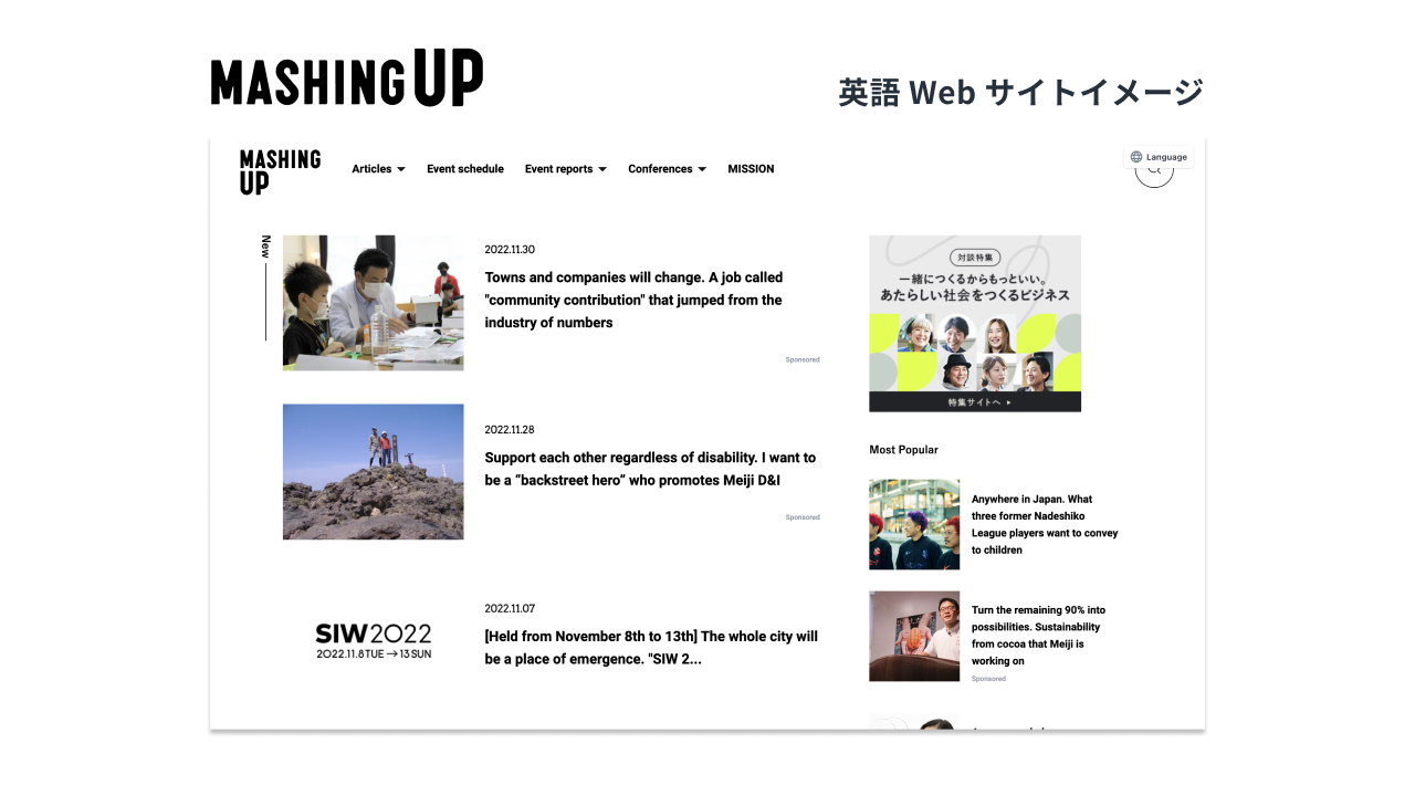 MASHING UP は、イベントやメディアを通じ、性別、業種、世代、国籍を超え多彩な人々と対話を深め、これからの社会や組織のかたち、未来のビジネスを考えるメディア&コミュニティサイトです。会員メンバー数 45,000人以上の MASHING UP では、メディアやカンファレンスなどを通じて多彩なテーマでコミュニケーションを活性化させ、新しいビジネスを創出する場を提供しています。今回、海外にも情報を発信していきたいクライアントニーズに応え、Web サイトを英語で公開いたしました。