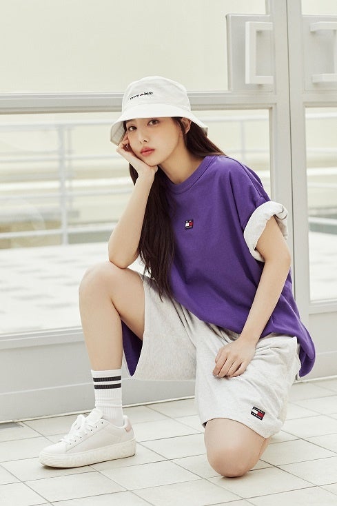 キャンペーンビジュアルでナヨンが着用するのは、ウェストストラップが印象的なクロップド丈のトップスとマイクロスカートのセットアップ。そのほかワンポイントロゴのリバーシブルのパープルのTシャツに、ライトグレーのショーツを合わせたスタイリングを披露。クロップド丈のデニムジャケットにブラトップ、バギーシルエットのデニムパンツのコーディネートはトミー ジーンズが提案するモダンストリートウェアを体現します。