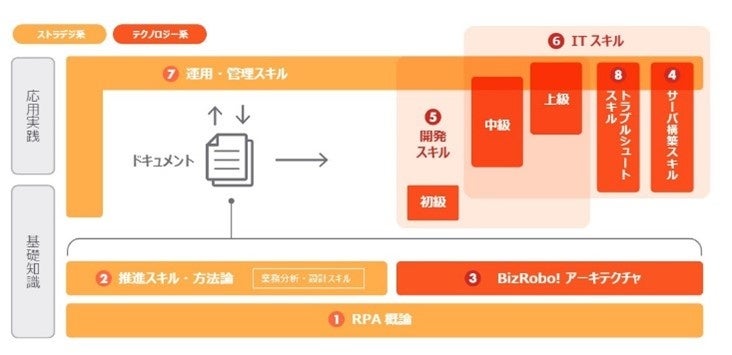 今回のリニューアルでは、eラーニングのコンテンツをBizRobo!の開発・運用・推進に必要な8つのスキルを習得できる構成とし、全57レッスン(うち新規公開30レッスン)を公開しています。