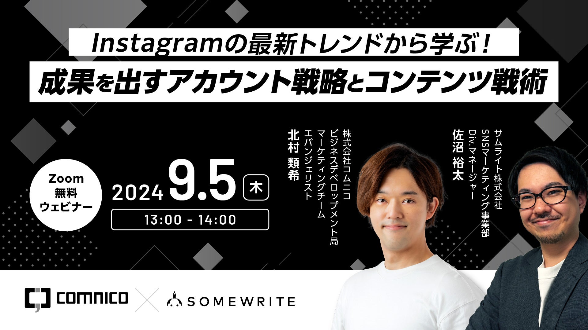 企業のコンテンツマーケティングやメディアビジネス等を支援するサムライト株式会社(本社:東京都港区、代表取締役社長:池戸 聡、以下「サムライト」)は、株式会社コムニコと共催で、9月5日(木)13時より、無料オンラインセミナー「Instagramの最新トレンドから学ぶ!成果を出すアカウント戦略とコンテンツ戦術」を開催いたします。