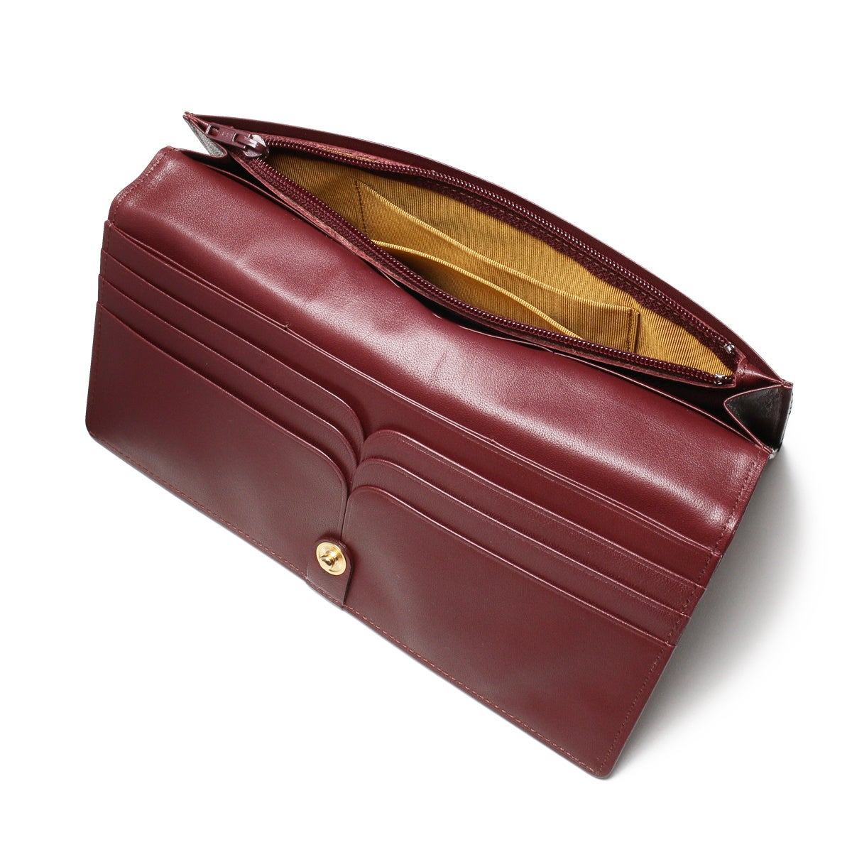 しっかり材料を使い切ることも念頭において開発に挑んだロングウォレット。本体の材料になる革には、牛革で最も代表的なステアレザーを使用しました。生後2年を経過した牛の革で、革質が柔らかく、肌目も細かく、芯通しでクロムなめしの革はエレガンスが特徴です。 この材料をさらに軽くする為に、革をミリ単位で調整しながら限界の薄さに漉き、裏地に使う生地も極薄を使用。 薄くても型崩れしない様に、一般的な厚い芯地は一切使わず、中に縦式で入るカードの硬さで併用させました。また、カードの出し入れにストレスを無くす為、横式で入るカード入れを業界では革新的なフラップ形状で縫製しました。(この部分は更に改良を加えました。)その結果、カードの縦入れ式と横入れ式が共存し、非常に分類しやすく、使い勝手のよさに循環することに成功しました。ジップ引き手には革紐を使うことで異物感をなくし、かつ、つまみやすさにも配慮し、革紐のスペアも丁寧に同封しました。 19枚のカードが入る大容積で、薄くて使い勝手のよいハイスペックなロングウォレットの誕生です。(新たにコインケース内に、隠しカードケースを1枚分追加)更なる改良として、財布の開閉に隠しホックを採用し、不用意に開かない安心感を外見は変えることなく追加しました。