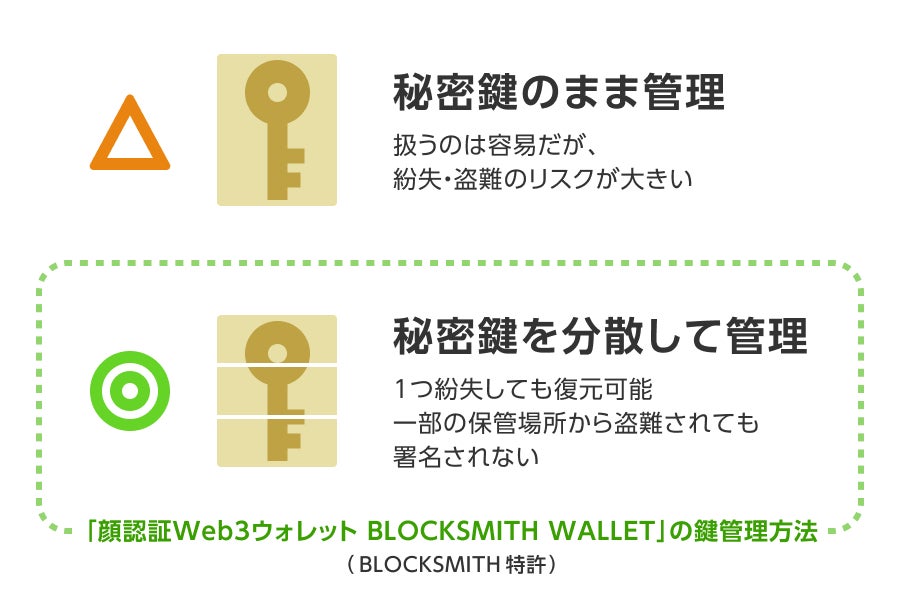 事業者は秘密鍵の一部を保有するにとどまり、ユーザーの関与がなければ、暗号資産の移転ができないことから、ノンカストディアルウォレットを実現しています。※1なお、BLOCKSMITHはこの生体認証を用いた秘密鍵の分散管理の仕組みについて特許を取得しています。