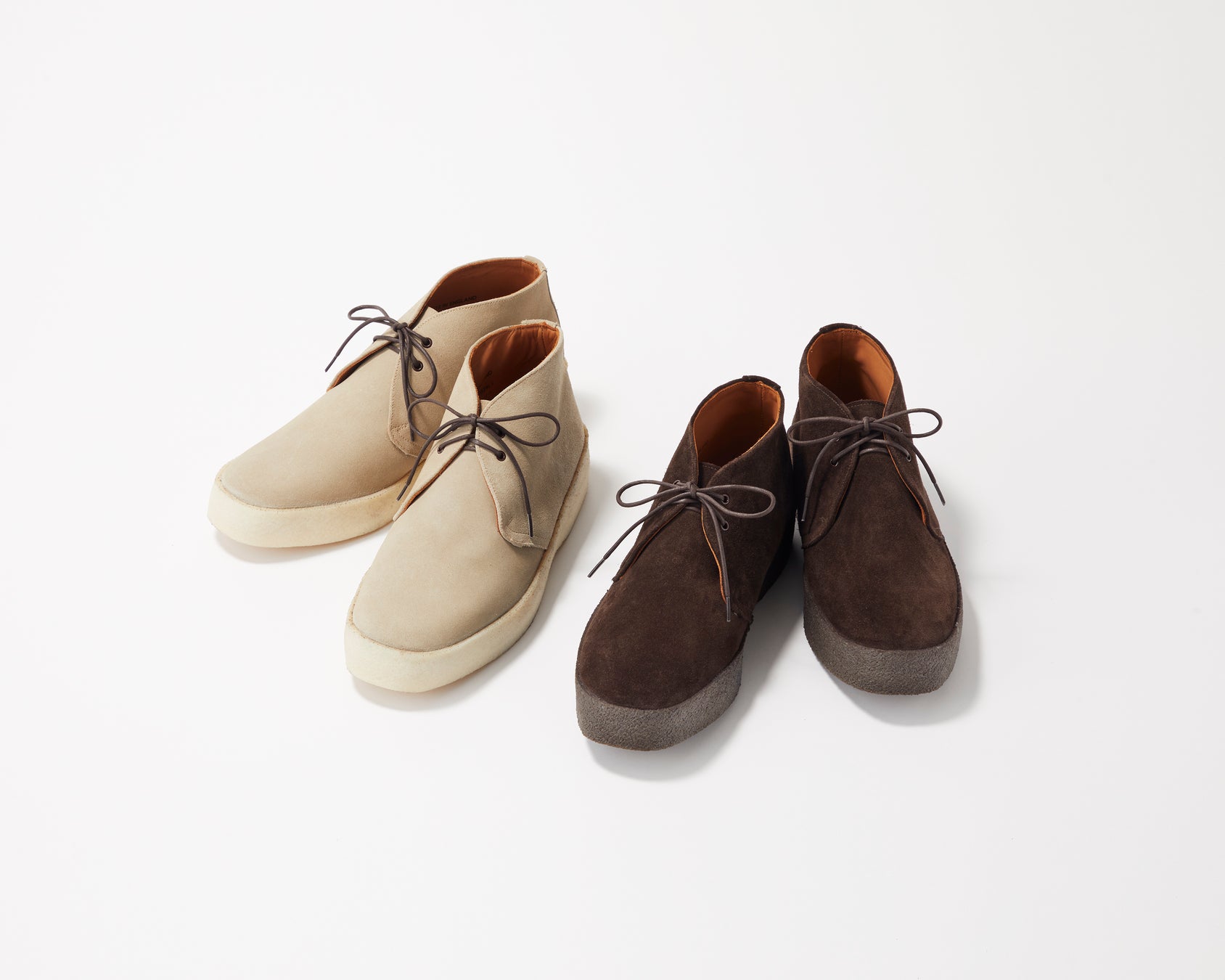 SANDERSを代表するモデルであるBRIT CHUKKAをよりダークなブラウンとインラインでは展開のないサンドベージュで別注。スエードはCHARLES・F・STEAD(チャールズ・F・ステッド)社のスーパーバック(スエード)を使用し、通常のインラインにはないハトメを外側に配しアクセントとしています。