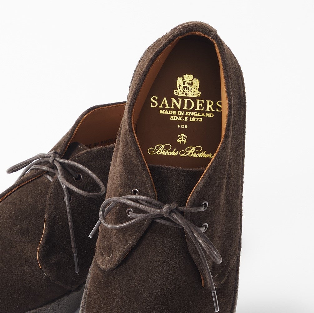 今回のコラボレーションにおいてセレクトされたのは、サンダースを代表するモデルの一つでMUDGUARD(マッドガード)製法という水や泥を除けることを目的とした製法で作られた“BRIT CHUKKA/ブリットチャッカ”と、サンダース社が収蔵しているミリタリーシューズのアーカイブをベースに作られたモデルである“MILITARY DERBY SHOE/ミリタリー ダービー シューズ”の全2型です。チャッカブーツはブラウン・サンドベージュの2色展開となり、よりダークなブラウンとサンドベージュはブルックス ブラザーズが別注したコラボ限定エクスクルーシブカラーです。通常のインラインでは見られないハトメを外側に配しアクセントとしているのもポイントです。ミリタリー ダービー シューズは、フランスのアノネイ社が手掛けるドレッシーな表情のフレンチカーフをセレクト。レザーのインソールにはブルックス ブラザーズとサンダースのダブルネームの刻印入り。