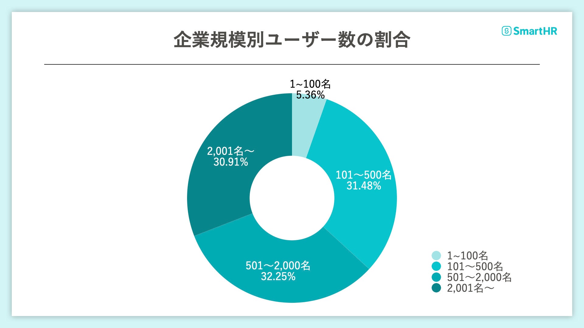 「人事評価」機能の企業規模別ユーザー数を割合で見ると、101〜500名、501〜2,000名、2,001名以上の企業に所属するユーザーが各々30%以上を占めており、所属する企業規模にあまり偏りなく評価業務が行われていることが見て取れます。