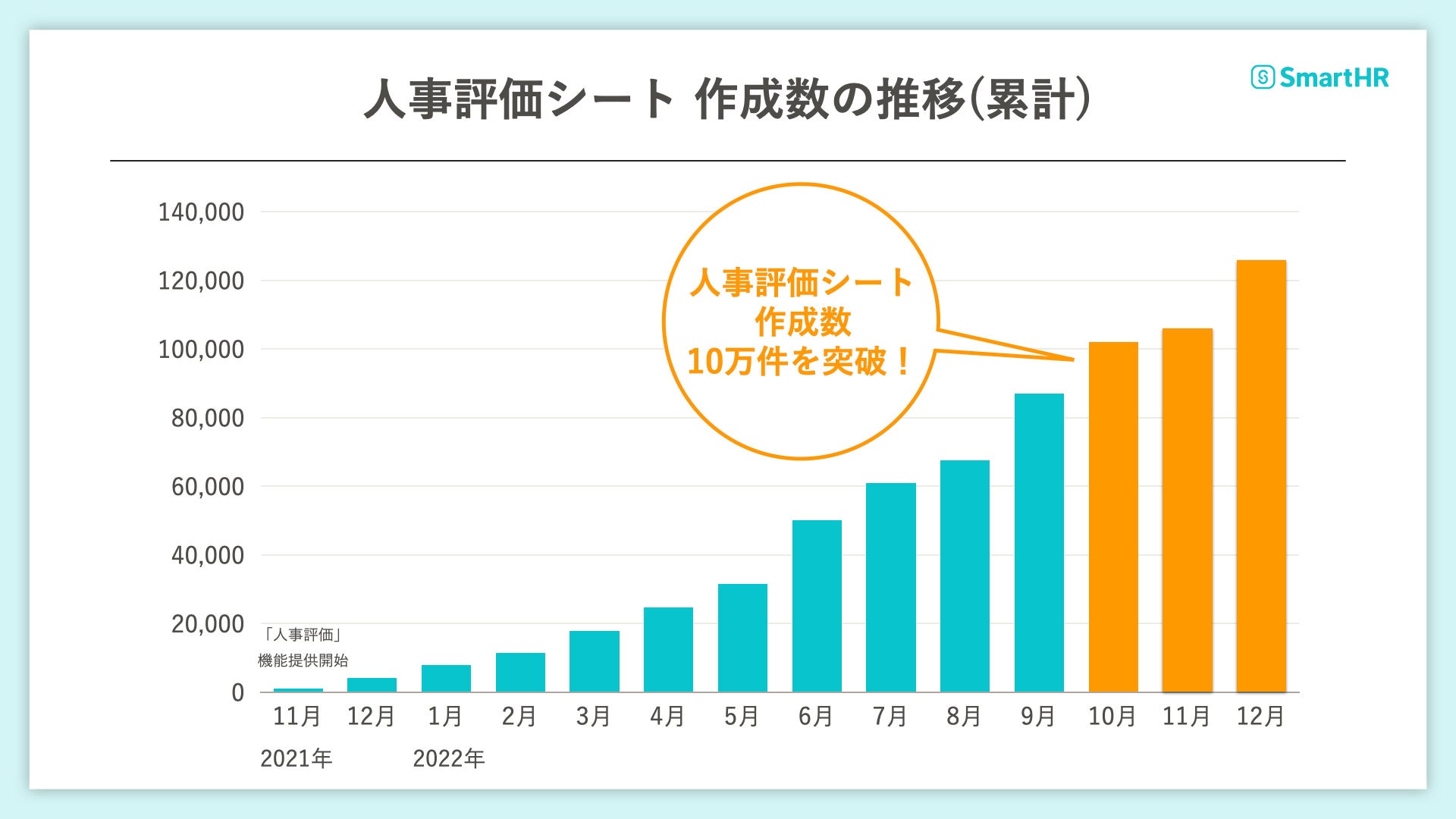 SmartHRでは、人事担当者の「人事評価の納得感を上げたい」「人事評価プロセスのムダを減らし、人事業務の質を向上させたい」などの声をもとに「SmartHR」の機能として2021年10月28日に「人事評価」機能の提供を開始しました。「人事評価」機能は、「SmartHR」内に蓄積された従業員情報を活用して評価シートや評価フローを自由にカスタマイズしながら人事評価を行えるため、人事担当者の業務負荷削減に繋がります。また、評価プロセスや結果の見える化により従業員の納得感の向上も期待できます。「人事評価」機能は、提供開始から一年が経過した2022年10月、評価対象者ごとに作成する評価シートの作成数が10万件に達しました。(※2)