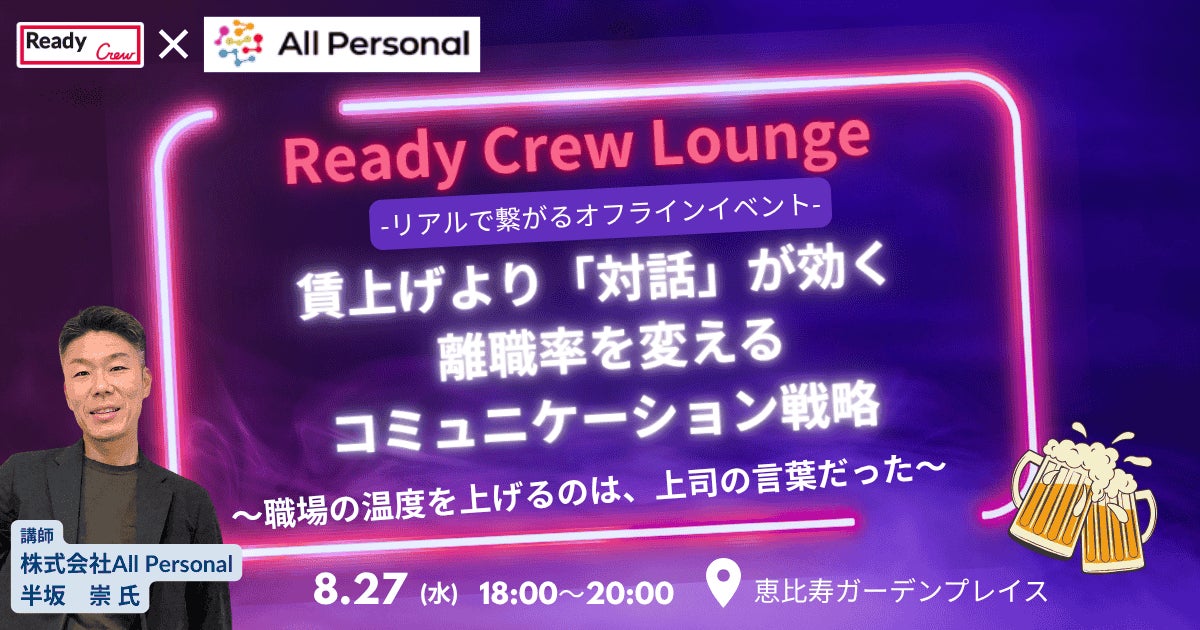 ビジネスマッチングコミュニティ「Ready Crew(レディクル)」を運営するフロンティア株式会社(本社:東京都渋谷区、代表取締役社長:高橋 政裕)は、経営者・人事・マネジメント層を対象とした実践型セミナー「賃上げより『対話』が効く ― 離職率を変えるコミュニケーション戦略~職場の温度を上げるのは、上司の言葉だった~」を、2025年8月27日(水)に恵比寿本社にて開催いたします。(参加無料・先着30名)