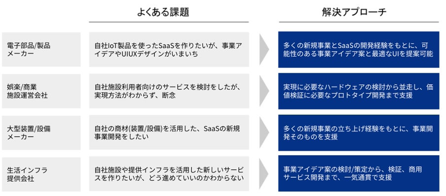 電子部品・製品メーカーや施設運営会社など、自社資産をもつ企業それぞれの課題に合わせたSaaSの開発支援を提供可能