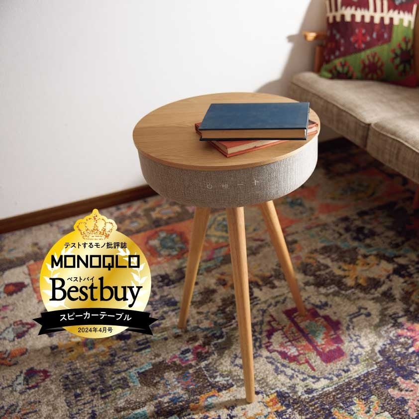 見ためはシンプルな3つ脚のサイドテーブルのスピーカー。どんな部屋にもマッチし、軽くて持ち運びも簡単。バッテリーを内蔵しているから、ケーブルにわずらわされることがないのも推しポイント。スマホの置くだけ充電にも対応しています。ツイーター、ミッドレンジユニット、パッシブラジエーターを備え独立した4つのスピーカーは、ピラミッドバランスを実現。高音は上から、低音は下から出ているようで、厚みのある中域は水平に広がります。ボーカルの情報量も多く、繊細なニュアンスまで伝わるほど。音質はややウォームで、女性ボーカルとの相性は良好。テンポのいい楽曲のスピード感も上手に伝えてくれます。類似のテーブルスピーカーと聴き比べても、音質のよさ、音の広がりが段違いでした。