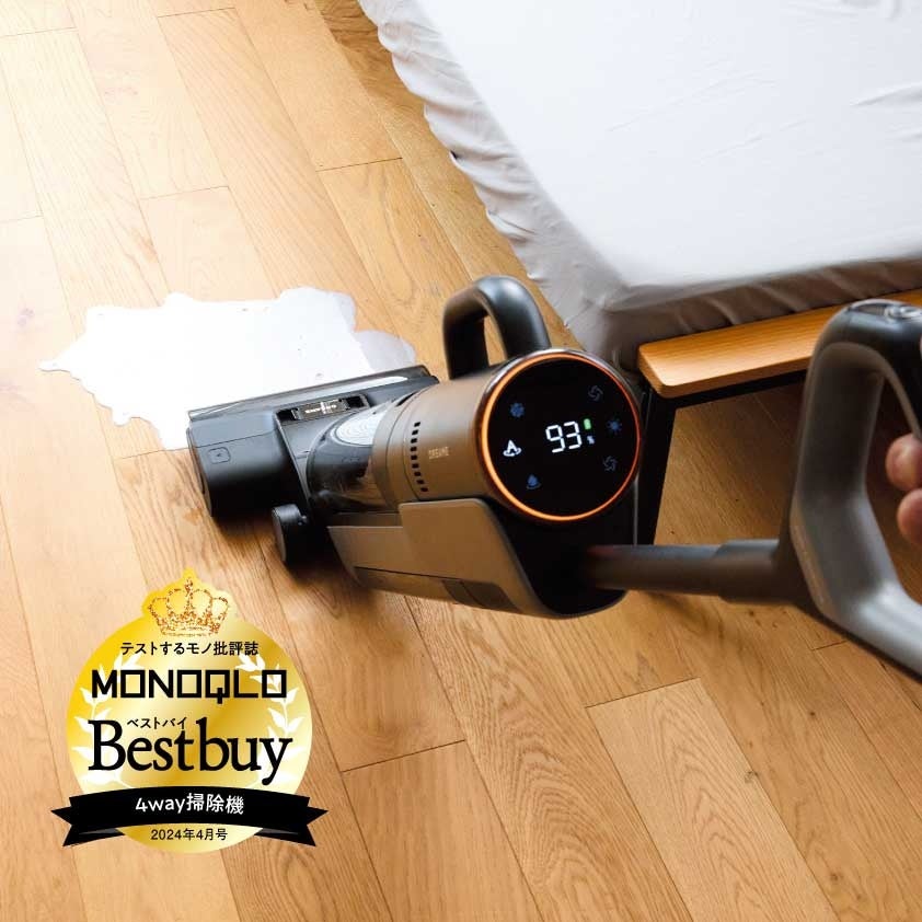 スティック・ハンディ・布団クリーナー・水拭きと4役をこなすコードレス掃除機です。水拭き性能は高評価で、ベタついた汚れを簡単に吸い取ってくれます。同時に本体のタンクで生成した電解水を使って水拭きしてくれるため、ヘッドが通過したあとの床はとってもすっきり。掃除を中断するときに自立させられるのも便利です。アタッチメントのソフトブラシユニットを装着した乾拭きは、フローリング、カーペット、じゅうたん上でしっかりゴミを吸い取ってくれました。軽いので小回りが利き、狭い場所も掃除がしやすかったです。一台で家中のあらゆる汚れに対応したい人にはおすすめです。