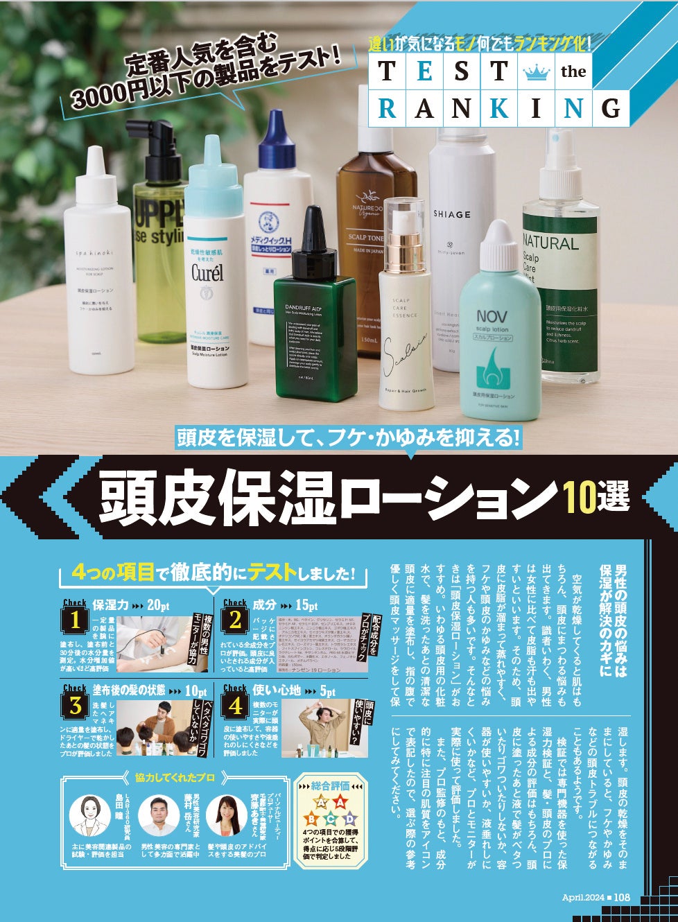 特に保湿力が優れていて、モニター全員の肌の水分値が大幅に増加して、保湿力が全製品中で唯一の満点評価を獲得。成分も優秀で、特に識者が注目したのは、保湿成分の数の多さ。セラミドやベタインなどの頭皮のうるおいを保つ、良成分が配合されています。他にも頭皮に良いとされる成分が数多く配合されており、こちらも満点評価です。容器も使いやすく押しやすいので、適量を的確に塗布できると使い心地の評価も最高点でした。とにかく頭皮の乾燥が特に気になる人はぜひ試してみてほしい製品です。